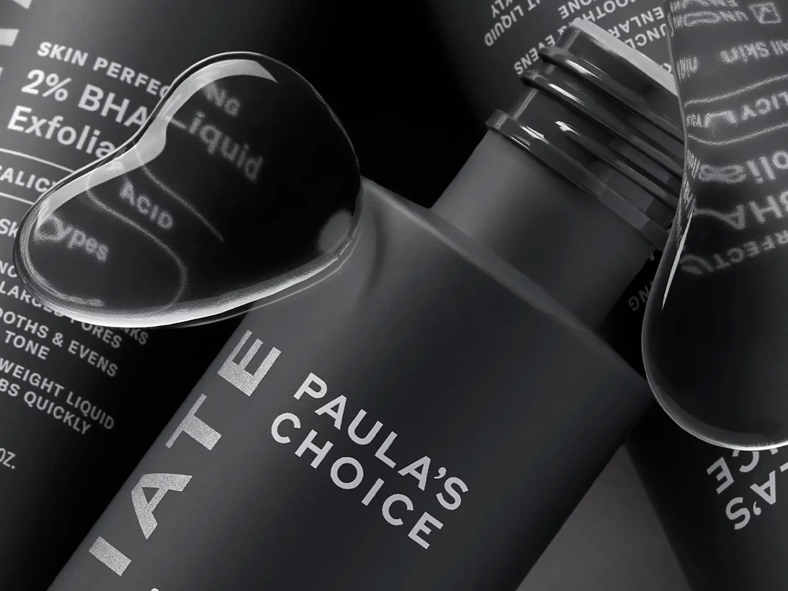 Kolme Paula's Choice -tuotetta lähikuvassa harmaalla taustalla ja vesipisaroita etualalla.