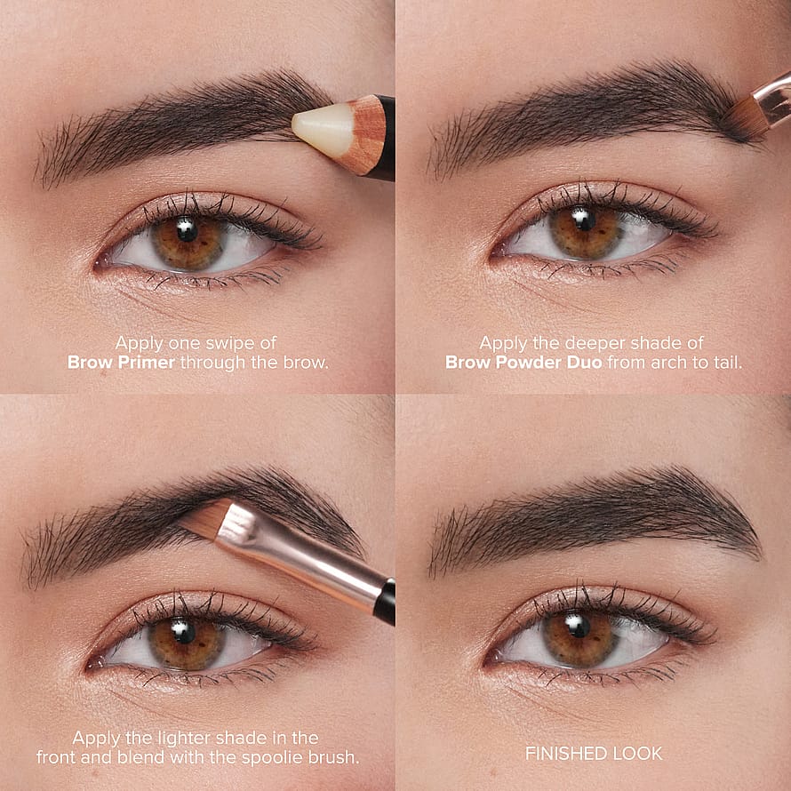 Aloita ensiksi vaalealla sävyllä täyttäen kulman loppuosaa tummemmalla sävyllä. Levitä tuotetta Anastasia Brush # 15 tai Anastasia Brush # 7 ja mikäli haluat vielä kestävämmän lopputuloksen, levitä ensin Brow Fix Primer tuotetta kulmiisi. Brow Powder Duo tuote on saatavilla monessa eri sävyssä, jotta sinullekin löytyisi täydellinen vaihtoehto. Tuotetta voi myös käyttää luomivärinä.
