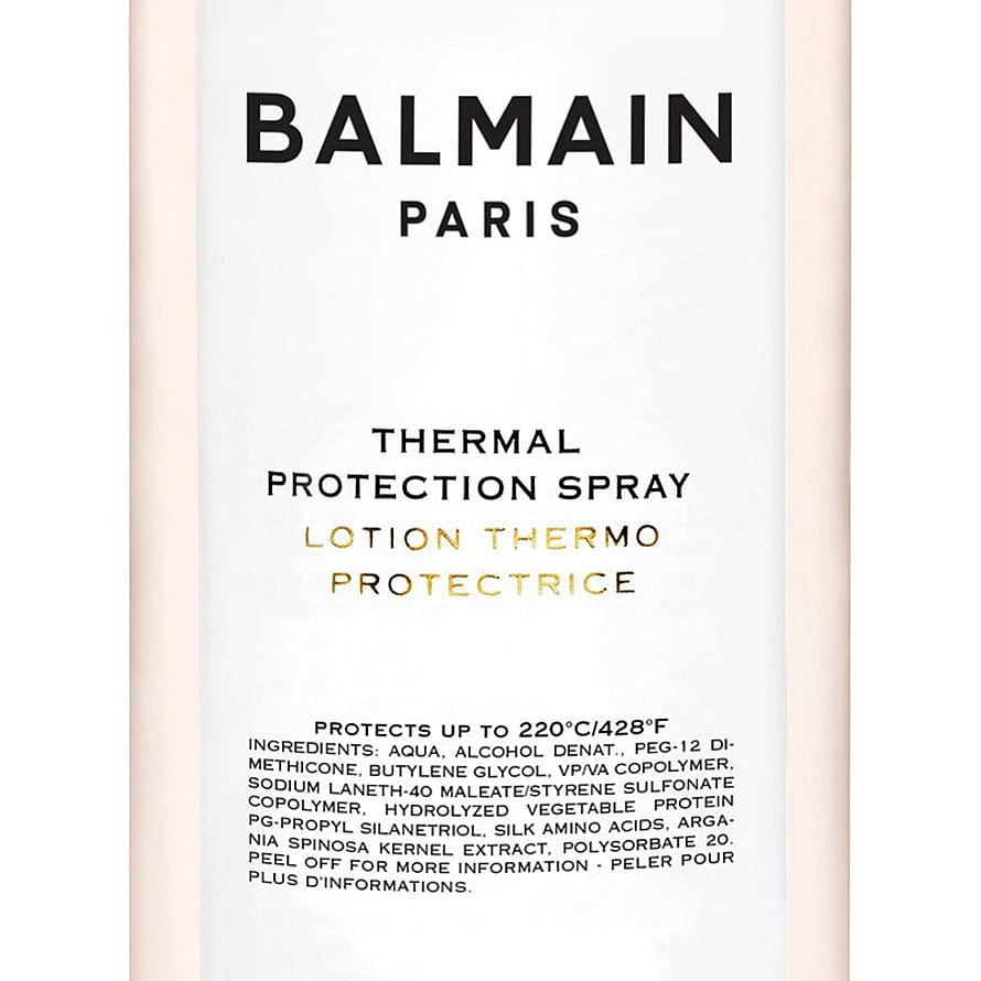 Balmain Thermal Protection Spray on kevyt suihke, joka muodostaa lämpösuojan hiuksille jopa 220°C asti, estää kosteuden haihtumista, lisää kiiltoa ja vähentää pörröisyyttä ja haaroittuneita latvoja ilman, että hiukset tuntuvat raskailta.