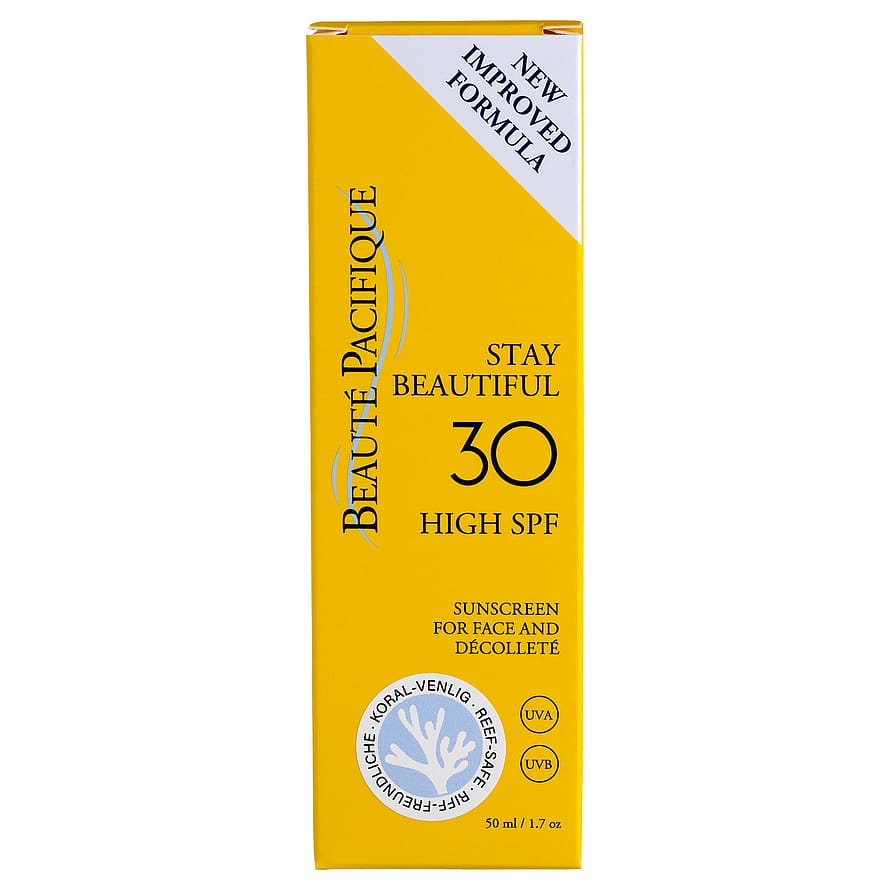 Stay Beautiful on tehokas ja hoitava aurinkosuojatuote kasvoille ja dekolteelle. Tuotteessa on kaksinkertainen ikääntymisen vaikutuksia torjuva vaikutus. Ainutlaatuinen UV-suojakoostumus suojaa ihoa sekä UVA- että UVB-säteilyltä. Tuote sisältää tehokkaan yhdistelmän E-vitamiinia, resveratrolia ja prosyanidiinia, jotka on uutettu Beauté Pacifiquen erityisestä chileläisestä viinirypäleensiemenuutteesta ja jotka ehkäisevät auringon aiheuttamia vaurioita ja ennenaikaista ikääntymistä. Skvalaani kosteuttaa ihoa ja kuljettaa resveratrolin ja prosyanidiinin syvälle ihoon.