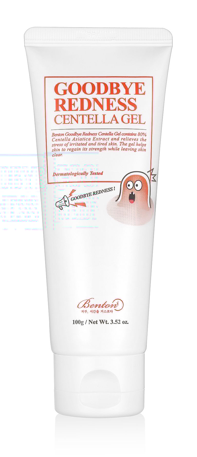 Benton Goodbye Redness Centella Gel on kevyt, kosteuttava geeli, joka lievittää punoitusta ja ärsytystä. Perustuen peräti 80-prosenttisesti uutteeseen Centella Asiaticasta (suosittu ainesosa korealaisessa ihonhoidossa) tämä geeli pehmentää ja rauhoittaa sekä korjaa herkkää ja ärtynyttä ihoa. Geelin pH-arvo on hieman hapan, ~6, jotta se tasapainottaisi ihon luonnollista pH-arvoa terveen ja hyvin toimivan ihonsuojan saavuttamiseksi. Sisältää myös tea tree -uutetta, joka vaikuttaa anti-inflammatorisesti ja rauhoittavasti.