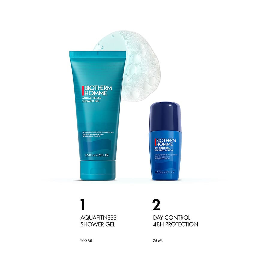 Aquafitness Holiday Set sisältää Aquafitness Shower Gel 200 ml- ja Day Control 48H Roll-on -tuotteet.