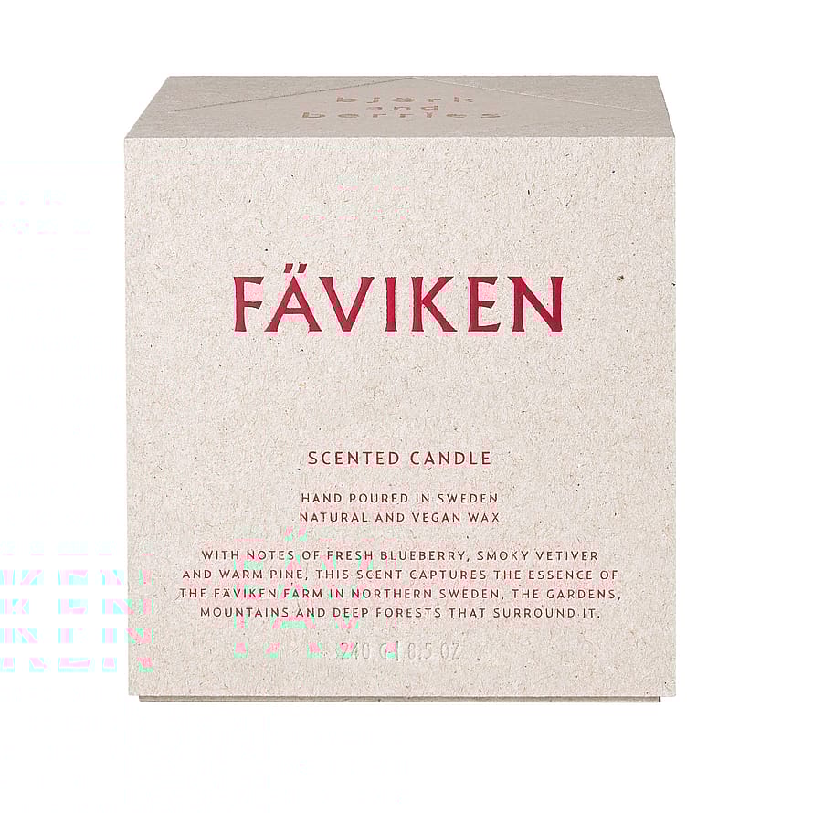 Tämän tuoksukynttilän raikkaan mustikan, savuisen vetiverin ja lämpimän männyn vivahteet tuovat mieleen Pohjois-Ruotsissa sijaitsevan Fävikenin tilan puutarhat ja sitä ympäröivät metsät.