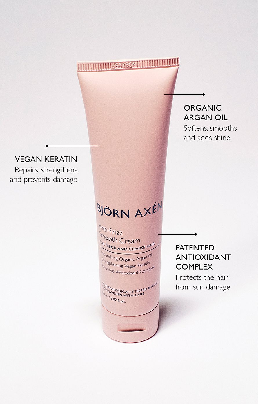 ”Hiuksiin jätettävä muotoiluvoide hoitaa, pehmentää ja silottaa hiuksia sekä vähentää pörröisyyttä. Muotoiluvoiteen sisältämä ekologinen arganöljy ja vegaaninen keratiini korjaavat ja vahvistavat hiuksia sekä lisäävät niiden kiiltoa. Muotoiluvoide sisältää myös patentoidun antioksidanttiyhdisteen, joka vahvistaa hiuksia ja suojaa niitä auringon aiheuttamilta vaurioilta. Tuote tekee hiuksista vahvat, sileät ja luonnollisen kiiltävät.