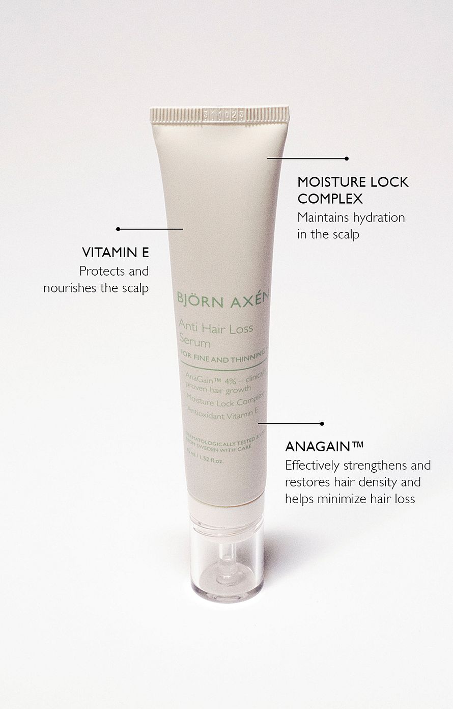 Hiuspohjan seerumi elämäntyyliin liittyvää hiustenlähtöä vastaan. Sisältää ekologista AnaGain™-herneenversouutetta, jonka on kliinisesti todistettu vahvistavan hiuksia tehokkaasti. Lisäksi sen on todistettu palauttavan hiusten tuuheuden ja luovan optimaaliset olosuhteet hiusten kasvulle pidentämällä hiuksen kasvusykliä ja stimuloimalla kasvua tyvestä lähtien. Seerumi sisältää myös hiuspohjan kosteustasapainoa ylläpitävän Moisture Lock Complex -ainesosan ja E-vitamiinia, jolla on antioksidanttinen vaikutus. Ei sisällä hajusteita. Imeytyy nopeasti eikä jätä tuotejäämiä. Sopii kaikille hiustyypeille. Vegaaninen ja dermatologisesti testattu.