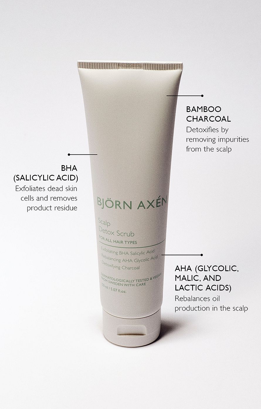 Syväpuhdistava kuorinta-aine, joka sisältää kuorivia AHA- ja BHA-happoja, bambuhiiltä ja pehmeitä pyöriviä kuorimisrakeita, jotka liukenevat hieronnan aikana. Salisyylihappo (BHA) poistaa kuolleet ihosolut ja tuotejäämät, kun taas glykolihappo, omenahappo ja maitohappo (AHA) tasapainottavat hiuspohjan talintuotantoa. Bambuhiili puhdistaa hellävaraisesti hiuspohjan epäpuhtauksia poistamalla. Kuorinta-aine luo ihanteelliset edellytykset terveelle hiuspohjalle ja antaa virkistävän ja viilentävän tunteen sekä miellyttävän piparmintun tuoksun. Sopii kaikille hiustyypeille, etenkin kutisevalle ja epätasapainoiselle hiuspohjalle. Vegaaninen ja dermatologisesti testattu.
