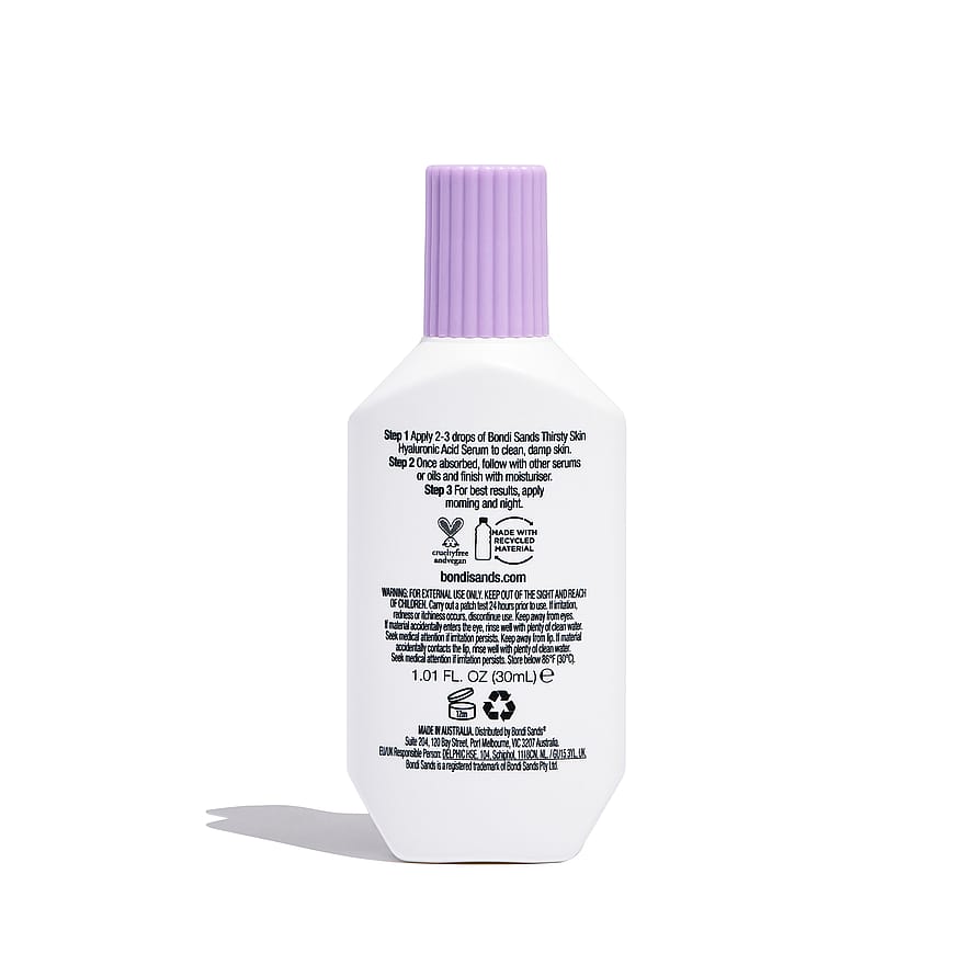 Thirsty Skin Hyaluronic Acid Serum sammuttaa ihon janon! Tehokkaasti kosteuttava seerumi lukitsee kosteuden ihoon tehden siitä välittömästi täyteläisemmän ja virkeämmän näköisen. Koostumus sisältää mm. hyaluronihappoa ja merileväuutetta, joilla on kosteuttavia ja täyteläistäviä ominaisuuksia. Sopii kaikille ihotyypeille, myös herkälle. Vegaaninen.