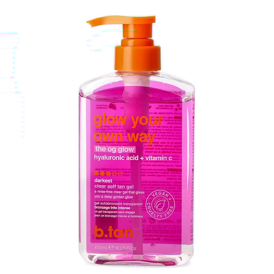 Glow Your Own Way Clear Self Tan Gel on läpinäkyvä ja tumma itseruskettava geelimäinen voide. Sisältää hyaluronihappoa ja C-vitamiinia, jotka antavat iholle lisää hehkua. Läpinäkyvää, hankausta kestävää geeliä ei tarvitse huuhdella pois. Geeli tekee ihosta kosteutetun ja pehmeän sekä luo iholle upean ja luonnollisen rusketuksen. 100% vegaaninen ja parabeeniton.