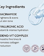 • Niacinamidi: Kirkastaa ja tasoittaa ihon sävyä, parantaa rakennetta ja tarjoaa luonnollista hehkua.