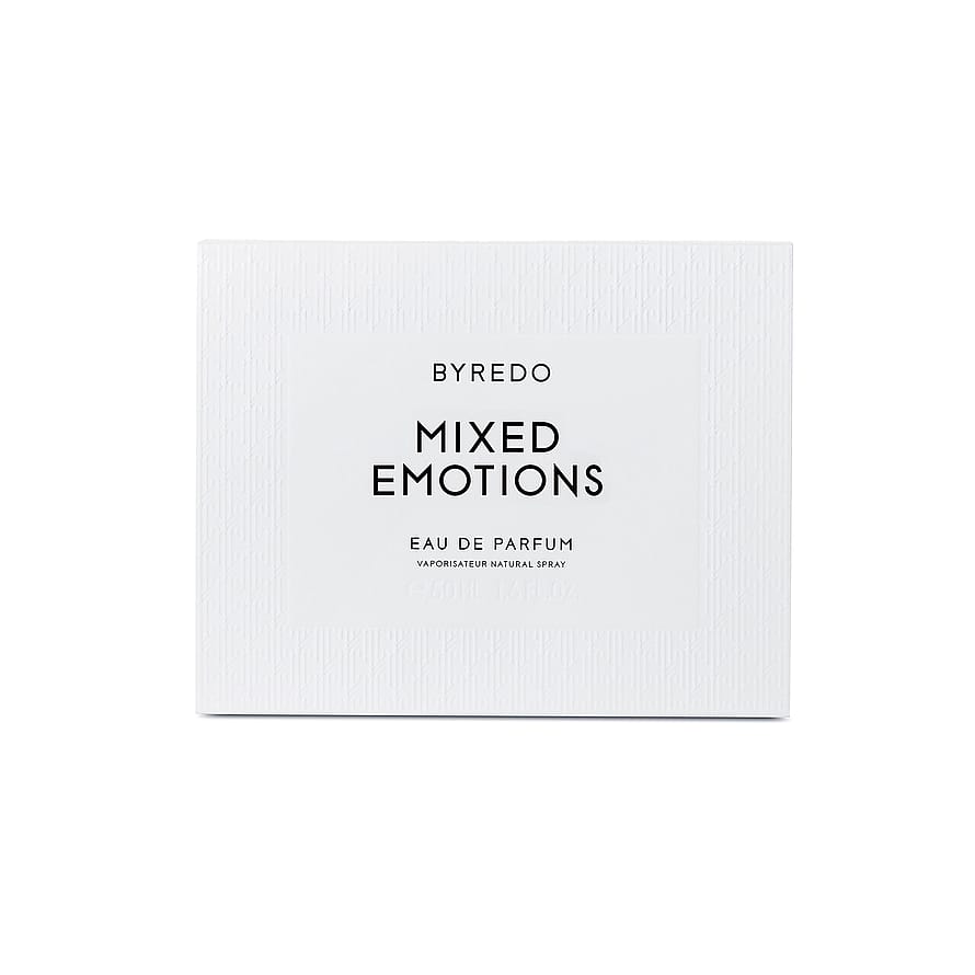 BYREDO haluaa tehdä muistoista ja abstrakteista ideoista tuoksuja, ja Mixed Emotions edustaa tätä filosofiaa. Se on tuoksuluonnos nykyhetken kollektiivisesta mielentilasta. Lämpimät maten vivahteet ja mustaherukan terävä makeus yhdistyvät puun sävyihin. Rauhoittava musta tee antaa tilaa synteettisille orvokinlehdille.