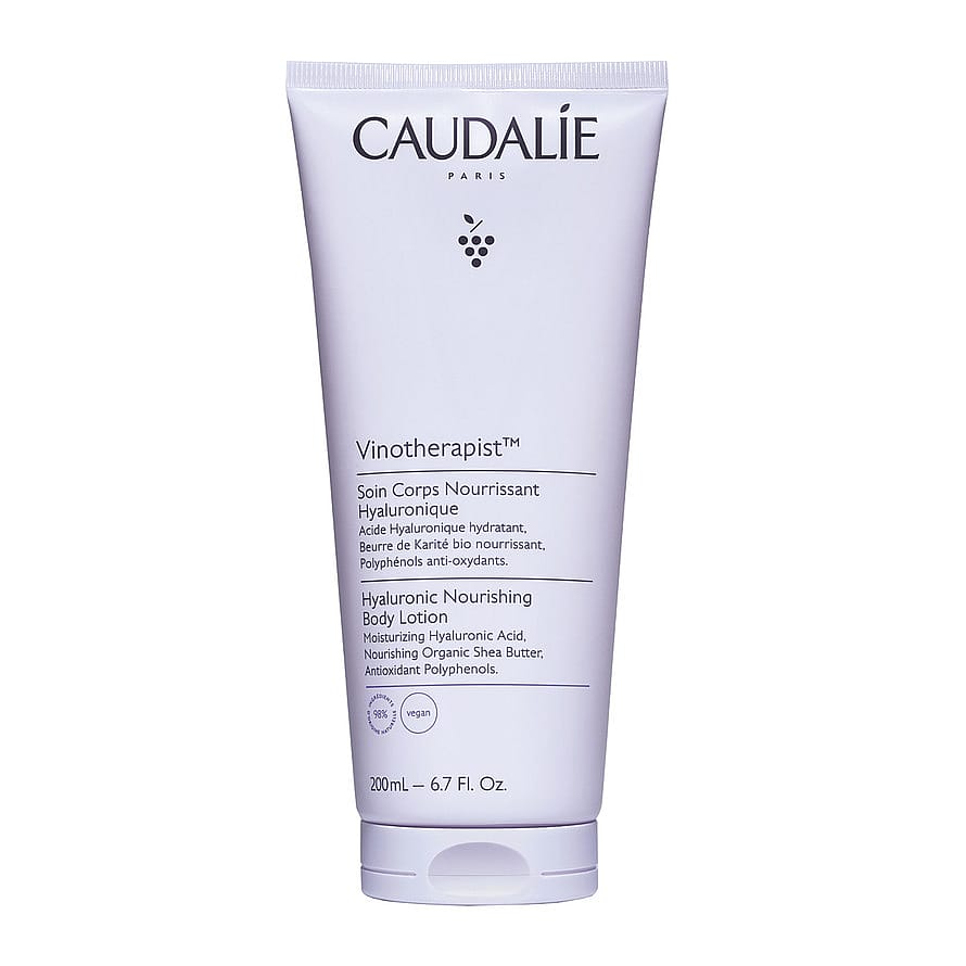 Caudalie Vinotherapist™ Hyaluronic Nourishing Body Lotion -vartaloemulsio sisältää hyaluronihappoa, ekologista karitevoita ja polyfenoleita. Se kosteuttaa ja ravitsee välittömästi tehden ihosta pehmeän, kimmoisan ja hehkuvan, kuin Vinothérapie™ Spa -kylpylähoidon jälkeen. Kevyt ja raikas koostumus imeytyy nopeasti ilman tahmaista tunnetta ja jättää iholle kevyen tuoksun. Vegaaninen koostumus. Testattu ihotautilääkärin valvonnassa. 98 % ainesosista on luonnollista alkuperää.