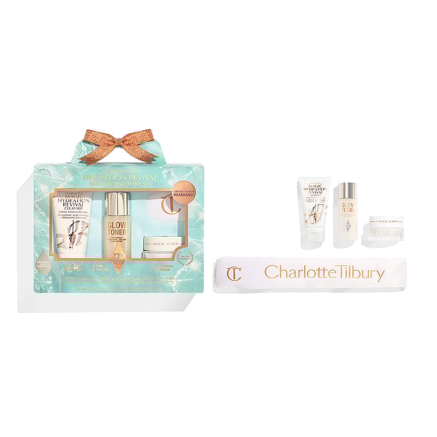 Charlotten Hydration Revival Skincare Discovery Set -pakkaus − Tehosta kosteutusta ja vähennä näkyvästi juonteita, ihohuokosia ja punoitusta välittömällä kosteuttavalla hoitomenetelmälläni!