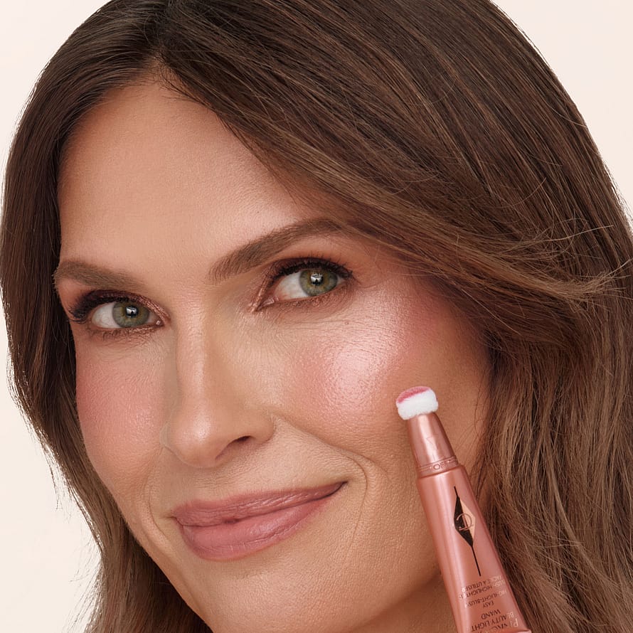 - Posket: Piste, piste, häivytys ja hehku Beauty Light Wandillasi. Käytä tyynyapplikaattoria levittämiseen, häivytä sitten ylöspäin ja poskiluiden suuntaisesti kaunistavaa Pinkgasm-hehkua varten.