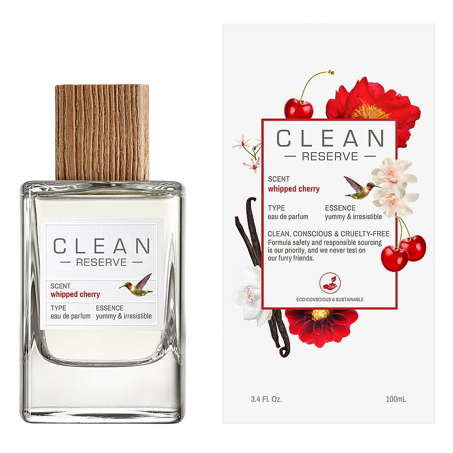 CLEAN RESERVE -kokoelma on luotu ihmiset ja planeetta keskiössä. Tuoksut sisältävät vastuullisia ja kierrätettyjä ainesosia, jotka hyödyttävät maanviljelijöitä ja heidän yhteisöjään. Whipped Cherry EdP sisältää vastuullista ja kierrätettyä setripuuta Yhdysvalloista auttaen tekemään tuoksunvalmistuksesta ympäristöystävällisempää ja kestävämpää.