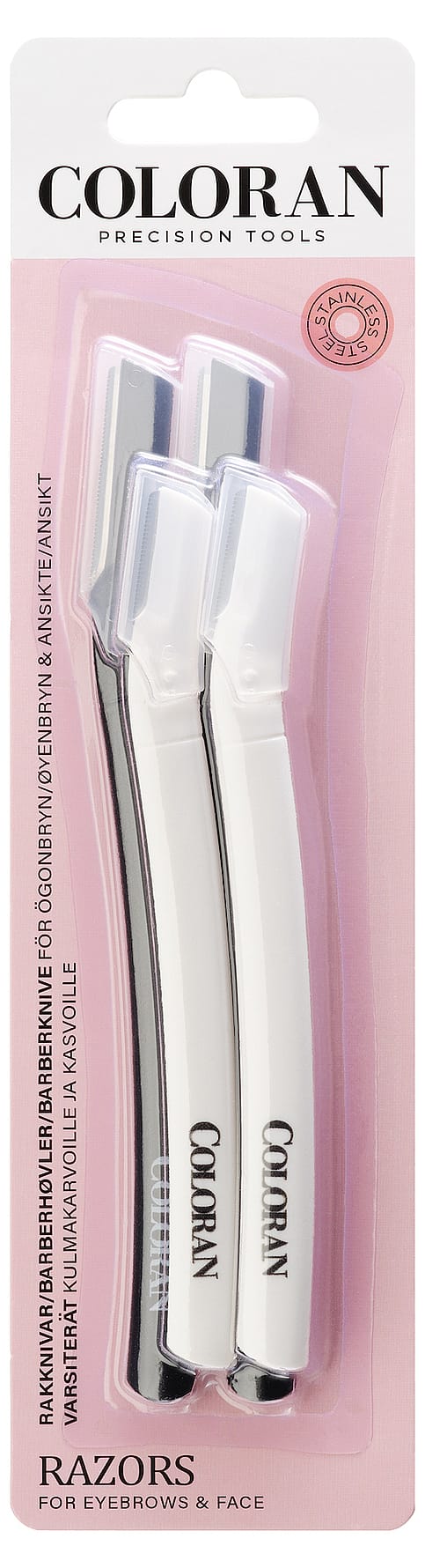 Tutustu Coloranin kulmakarva- ja kasvoveitsien äärimmäiseen tarkkuuteen. Veitsissä on korkealaatuisesta ruostumattomasta teräksestä valmistetut erittäin ohuet terät, mikä tekee niistä täydellisiä työkaluja kulmakarvojen helppoon muotoiluun. Kätevän terän avulla on helppo ja mukava poistaa jopa lyhyimmät karvat, jolloin kulmakarvoja ei tarvitse nyppiä tai vahata. Helppo ja kivuton käyttää ja sopii sekä naisille että miehille. Veitset sopivat kulmakarvojen muotoilun lisäksi täydellisesti myös epätoivottujen karvojen poistamiseen ylähuulesta, leuasta ja muualta kasvoista. Kevyesti kuoriva vaikutus tekee ihosta pehmeämmän ja sileämmän.