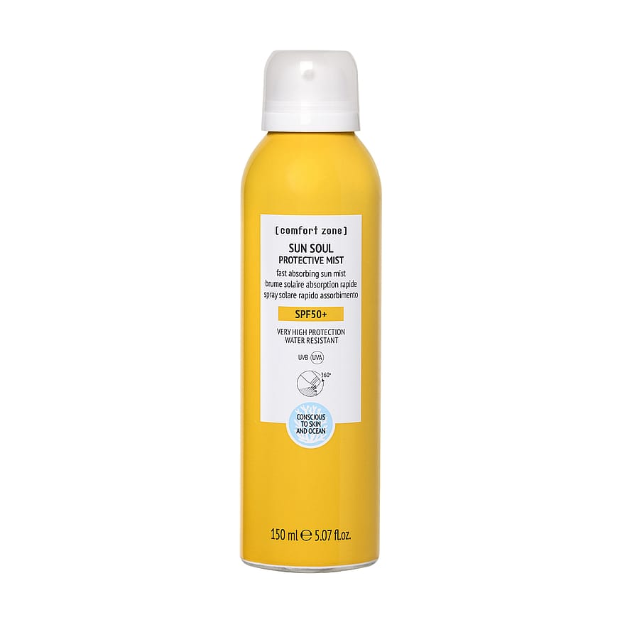 ”UV-säteilyltä suojaava Sun Soul Protective Mist on pakattu kätevään 360 asteen suihkepulloon, jonka ansiosta voit käyttää sitä missä vain vartalolla ja kasvoilla. Koostumus levittyy helposti ja imeytyy nopeasti. Saatavana kaksi eri voimakkuutta: High ja Very High Protection (SPF30 ja SPF50+). Tuote sisältää valonkestäviä kemiallisia aurinkosuojia, jotka on valittu huolella niin, että ne vaikuttavat mahdollisimman vähän merien ekosysteemeihin. Mikroselluloosan ansiosta UV-suojan osuus voidaan pitää mahdollisimman pienenä, mikä on hyväksi sekä sinulle että ympäristölle. Miedon ja miellyttävän tuoksun ainesosat ovat täysin biohajoavia. Kierrätettävä alumiinipakkaus. Suihkepumppu pitää paineen tasaisena ja päästää ulos vain ilmaa, ei kaasua. Tuotteessa on merkintä Concious to skin & ocean. SPF30 sisältää 78 % luonnollisista alkuperää olevia ainesosia, ja SPF50+ sisältää 67 % luonnollista alkuperää olevia ainesosia. 98 % ainesosista on turvallisia merien ekosysteemeille.