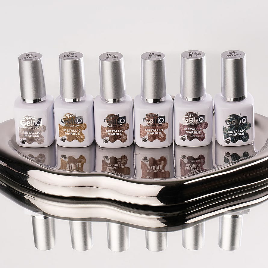 Syvyys ja vivahde vaihtelevat Metallic Marble -tehosteen alla käytettävän Gel iQ -geelilakan värin mukaan. Luo erilaisia valoheijastuksia valitsemasi designin mukaan. Lakka sisältää pigmenttejä, jotka muodostavat Pearl Metallic -tehosteen ja luovat syvyyttä, jolloin kuvio näkyy suunnittelun aikana.