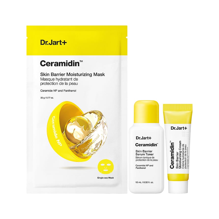 CERAMIDIN™ SKIN BARRIER SERUM TONER: Water\Aqua\Eau, Dipropylene Glycol, Betaine, Propanediol, Alcohol Denat., Glycosyl Trehalose, Glycerin, 1, 2-Hexanediol, Panthenol, Pentylene Glycol, Erythritol, Hydrogenated Starch Hydrolysate, Triethylhexanoin, Diphenyl Dimethicone, Polyglyceryl-10 Myristate, Ceramide Np, Sucrose Distearate, Ethylhexylglycerin, Sodium Hyaluronate, Theobroma Cacao (Cocoa) Seed Extract, Pelargonium Graveolens Flower Oil, Olea Europaea (Olive) Fruit Oil, Citrus Aurantium Bergamia (Bergamot) Fruit Oil, C12-14 Pareth-12, Hydrogenated Lecithin, Acrylates/C10-30 Alkyl Acrylate Crosspolymer, Tromethamine, Carbomer, Glyceryl Polymethacrylate, Glyceryl Stearate, Dextrin, Salvia Officinalis (Sage) Oil, Citronellol, Disodium Edta, Yellow 5 (Ci 19140) CERAMIDIN™ SKIN BARRIER MOISTURISING MASK: Water\Aqua\Eau, Glycerin, Dipropylene Glycol, 1, 2-Hexanediol, Panthenol, Hydrogenated Poly(C6-14 Olefin), Dicaprylyl Carbonate, Betaine, Methyl Trimethicone, Ceramide Np, Sodium Stearoyl Glutamate, Polyglyceryl-10 Stearate, Allantoin, Ethylhexylglycerin, Cholesterol, Pelargonium Graveolens (Geranium) Flower Oil, Olea Europaea (Olive) Fruit Oil, Citrus Aurantium Bergamia (Bergamot) Fruit Oil, Cetearyl Alcohol, Behenyl Alcohol, Acrylates/C10-30 Alkyl Acrylate Crosspolymer, Hydrogenated Lecithin, Tromethamine, Glyceryl Stearate Se, Salvia Officinalis (Sage) Oil, Sodium Phytate, Tocopherol, Yellow 5 (Ci 19140) Dr.Jart+ Ceramidin Cream: Water\Aqua\Eau, Glycerin, Caprylic/Capric Triglyceride, Dipropylene Glycol, Cetearyl Alcohol, Hydrogenated Polydecene, Methyl Trimethicone, Hydrogenated Poly(C6-14 Olefin), Butyrospermum Parkii (Shea) Butter, 1, 2-Hexanediol, Phenyl Trimethicone, Dicaprylyl Ether, Cetearyl Olivate, Panthenol, Glyceryl Stearate, Behenyl Alcohol, Sorbitan Olivate, Theobroma Cacao (Cocoa) Seed Extract, 2, 3-Butanediol, Cetearyl Glucoside, Ceramide Np, Ceramide Ng, Ceramide Ns, Ceramide As, Ceramide Ap, Cholesterol, Pentaerythrityl Distearate, Hydrogenated Lecithin, Palmitic Acid, Stearic Acid, Microcrystalline Cellulose, Glyceryl Stearate Se, Ammonium Acryloyldimethyltaurate/Vp Copolymer, Cellulose Gum, Dextrin, Glyceryl Polymethacrylate, Pelargonium Graveolens Flower Oil, Olea Europaea (Olive) Fruit Oil, Citrus Aurantium Bergamia (Bergamot) Fruit Oil, Salvia Officinalis (Sage) Oil, Citronellol, Tocopherol, Yellow 5 (Ci 19140).