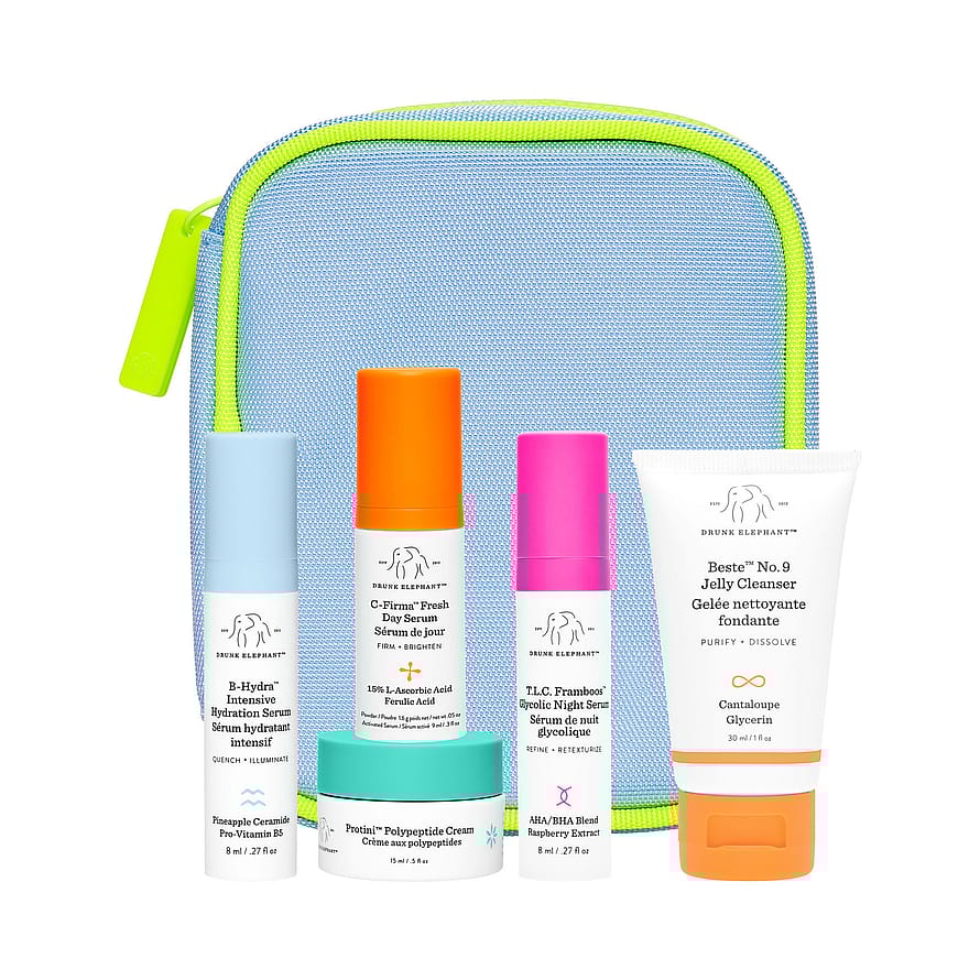 Drunk Elephantin The Littles 7.0 -ihonhoitosetti sisältää viisi matkakokoista tuotetta, jotka sopivat aamu- ja iltarutiineihin. Setti tarjoaa täydellisen ihonhoitorutiinin, joka puhdistaa, kuorii, kosteuttaa, kirkastaa ja vahvistaa ihoa, jotta se voi palautua hyvinvoivaan tilaan 30 päivässä.