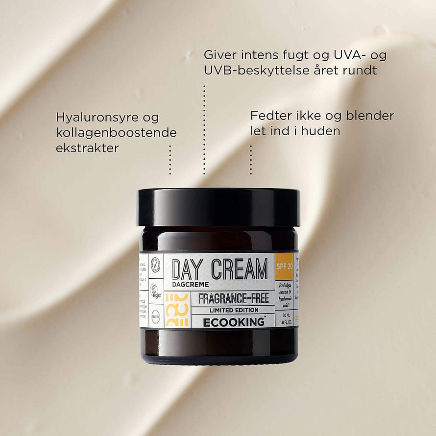 Day Cream SPF 20 sisältää useita ECOOKINGin suosikkiaineksia, kuten kosteuttavaa hyaluronihappoa ja suojaavaa E-vitamiinia, sekä kaksi kemiallista aurinkosuodatinta, jotka suojaavat ihoa auringon UVA- ja UVB-säteiltä. Voide stimuloi myös ihon kollageenin tuotantoa punalevän ja kurpitsansiemenuutteen avulla, jotka molemmat sisältävät runsaasti mineraaleja ja vitamiineja, jotka vahvistavat, kosteuttavat ja suojaavat ihoa.