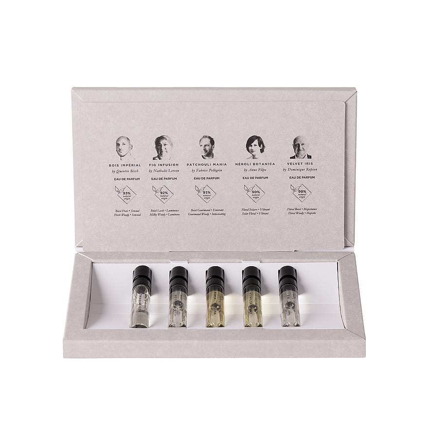 Nice Bergamote By Antoine Maisondieu: ALCOHOL DENAT., PARFUM (FRAGRANCE), AQUA (WATER), LIMONENE, LINALOOL, ETHYLHEXYL METHOXYCINNAMATE, HEXYL CINNAMAL, BUTYL METHOXYDIBENZOYLMETHANE, ETHYLHEXYL SALICYLATE, BHT, CITRAL, GERANIOL, COUMARIN, PENTAERYTHRITYL TETRA-DI-T-BUTYL HYDROXYHYDROCINNAMATE, CITRONELLOL, METHYL BENZOATE, BENZYL BENZOATE, CINNAMAL, EUGENOL Orange X Santal By Nathalie Gracia - Cetto: ALCOHOL DENAT., PARFUM (FRAGRANCE), AQUA (WATER), LIMONENE, ETHYLHEXYL METHOXYCINNAMATE, BUTYL METHOXYDIBENZOYLMETHANE, ETHYLHEXYL SALICYLATE, LINALOOL, BHT, GERANIOL, COUMARIN, EVERNIA PRUNASTRI (OAKMOSS) EXTRACT, CITRAL, CITRONELLOL, EUGENOL Rose Magnetic By Sophie Labbé: ALCOHOL DENAT., PARFUM (FRAGRANCE), AQUA (WATER), ETHYLHEXYL METHOXYCINNAMATE, LIMONENE, BUTYL METHOXYDIBENZOYLMETHANE, ETHYLHEXYL SALICYLATE, LINALOOL, BHT, GERANIOL, CITRONELLOL, COUMARIN, CITRAL, EUGENOL Mon Vetiver By Bruno Jovanovic: ALCOHOL DENAT., PARFUM (FRAGRANCE), AQUA (WATER), LIMONENE, ETHYLHEXYL METHOXYCINNAMATE, LINALOOL, BUTYL METHOXYDIBENZOYLMETHANE, ETHYLHEXYL SALICYLATE, BHT, COUMARIN, CITRONELLOL, ALPHA-ISOMETHYL IONONE, CITRAL, BENZYL BENZOATE, EUGENOL, GERANIOL, ISOEUGENOL The Musc By Calice Becker: ALCOHOL DENAT., PARFUM (FRAGRANCE), AQUA (WATER), ETHYLHEXYL METHOXYCINNAMATE, ALPHA-ISOMETHYL IONONE, BUTYL METHOXYDIBENZOYLMETHANE, ETHYLHEXYL SALICYLATE, CITRONELLOL, BHT, LINALOOL, CITRAL, BENZOIC ACID, BENZYL BENZOATE Divine Vanille By Olivier Pescheux: ALCOHOL DENAT., PARFUM (FRAGRANCE), AQUA (WATER), ETHYLHEXYL METHOXYCINNAMATE, COUMARIN, BUTYL METHOXYDIBENZOYLMETHANE, ETHYLHEXYL SALICYLATE, BENZOIC ACID, LIMONENE, LINALOOL, PENTAERYTHRITYL TETRA-DI-T-BUTYL HYDROXYHYDROCINNAMATE, BENZYL BENZOATE, GERANIOL, CINNAMAL, BHT Bois Imperial By Quentin Bisch: ALCOHOL DENAT., PARFUM (FRAGRANCE), TETRAMETHYL ACETYLOCTAHYDRONAPHTHALENES, AQUA (WATER), ALPHA-ISOMETHYL IONONE, LINALOOL, ETHYLHEXYL SALICYLATE, CEDRUS ATLANTICA OIL/EXTRACT, BUTYL METHOXYDIBENZOYLMETHANE, EUGENOL, PINENE, PENTAERYTHRITYL TETRA-DI-T-BUTYL HYDROXYHYDROCINNAMATE, BETA-CARYOPHYLLENE, LIMONENE, POGOSTEMON CABLIN OIL, ROSE FLOWER OIL/EXTRACT, ROSE KETONES, ALCOHOL, ISOEUGENYL ACETATE, TRIS(TETRAMETHYLHYDROXYPIPERIDINOL) CITRATE, TERPINEOL, TERPINOLENE Fig Infusion By Nathalie Lorson: ALCOHOL DENAT., PARFUM (FRAGRANCE), AQUA (WATER), LINALOOL, LIMONENE, ETHYLHEXYL METHOXYCINNAMATE, COUMARIN, BUTYL METHOXYDIBENZOYLMETHANE, ETHYLHEXYL SALICYLATE, CITRAL, BENZYL BENZOATE, BHT Patchouli Mania By Fabrice Pellegrin: ALCOHOL DENAT., PARFUM (FRAGRANCE), AQUA (WATER), LINALOOL, BUTYL METHOXYDIBENZOYLMETHANE, COUMARIN, BENZYL BENZOATE, BENZYL CINNAMATE, TOCOPHEROL, EUGENOL, LIMONENE, GERANIOL, FARNESOL, BENZYL ALCOHOL Neroli Botanica By Anne Flipo: ALCOHOL DENAT., PARFUM (FRAGRANCE), AQUA (WATER), BENZYL SALICYLATE, LINALOOL, BUTYL METHOXYDIBENZOYLMETHANE, LIMONENE, PENTAERYTHRITYL TETRA-DI-T-BUTYL HYDROXYHYDROCINNAMATE, ALPHA-ISOMETHYL IONONE, TOCOPHEROL, BENZYL BENZOATE, CITRAL, GERANIOL, BENZYL ALCOHOL, FARNESOL Velvet Iris By Dominique Ropion: ALCOHOL DENAT., PARFUM (FRAGRANCE), AQUA (WATER), TETRAMETHYL ACETYLOCTAHYDRONAPHTHALENES, LINALOOL, ACETYL CEDRENE, ALPHA-ISOMETHYL IONONE, BUTYL METHOXYDIBENZOYLMETHANE, TRIMETHYLCYCLOPENTENYL METHYLISOPENTENOL, LINALYL ACETATE, CITRUS AURANTIUM BERGAMIA (BERGAMOT) PEEL OIL, JUNIPERUS VIRGINIANA OIL, COUMARIN, LIMONENE, POGOSTEMON CABLIN OIL, PINENE, MENTHA PIPERITA (PEPPERMINT) OIL, MENTHA VIRIDIS (SPEARMINT) LEAF OIL, PENTAERYTHRITYL TETRA-DI-T-BUTYL HYDROXYHYDROCINNAMATE, BETA-CARYOPHYLLENE, CARVONE, MENTHOL, GERANIOL, TERPINOLENE, TERPINEOL, CITRONELLOL, MYROXYLON PEREIRAE OIL/EXTRACT, BENZYL BENZOATE, VANILLIN, ALPHA-TERPINENE, GERANYL ACETATE, BENZYL CINNAMATE, CITRAL