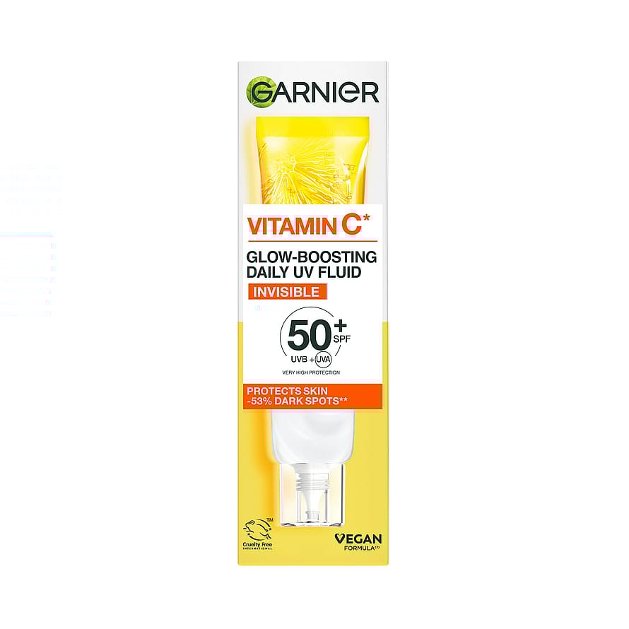 Garnier Skin Active Vitamin C* Glow Boosting Daily UV Fluid SPF50+ on kevyt, nestemäinen päivävoide, jonka koostumus antaa ihollesi kosteutusta koko päivän samalla kun se antaa suojaa UVB-, UVA- ja pitkiä UVA-säteitä sekä tummia läiskiä vastaan. Koostumus sisältää C-vitamiinia* antamaan ihollesi kaunista heleyttä.