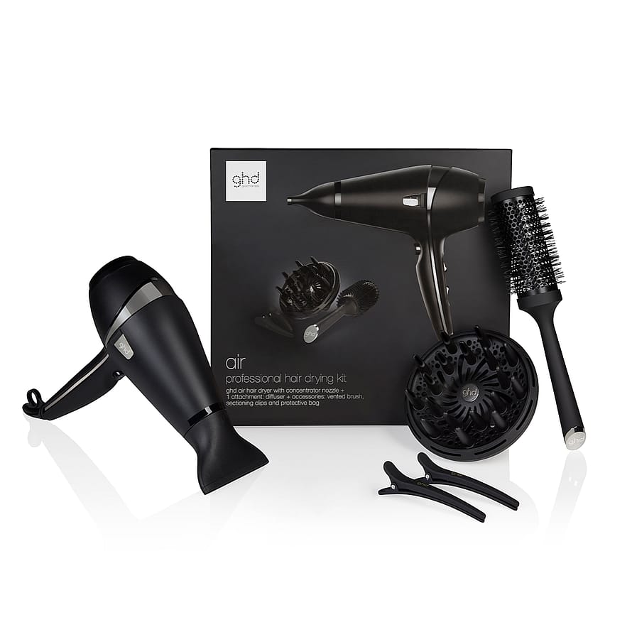 "Saa upeat hiukset nopeammin* ghd air® -hiustenkuivaussetillä. Tehokas 2 100 W:n ammattitasoinen moottori ja patentoitu irrotettava ilmansuodatin antavat korkeapaineisen ilmavirran nopeaan kuivaukseen. Edistynyt ionitekniikka vähentää pörröisyyttä ja sähköisyyttä ja antaa kampaamotasoisen lopputuloksen puolessa ajassa*.