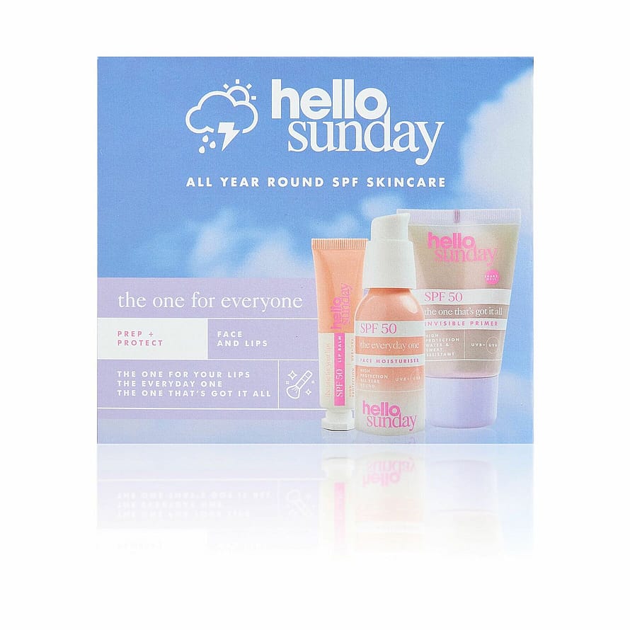 Hello Sunday The one for everyone- setti sisältää aurinkosuojatuotteita, jotka tuovat suojaa auringon UVA- ja UVB-säteilyä vastaan. Lahjapakkaus sisältää SPF50 huulivoiteen, SPF50 primerin sekä SPF50 kasvovoiteen.