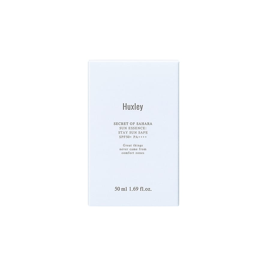 Huxley Sun Essence; Stay Sun Safe on intensiivisesti kosteuttava, suojakertoimen 50+ sisältävä aurinkosuojavoide, joka varjelee ihoa UV-säteiden haitallisilta vaikutuksilta. Sisältää ihon suojakerrosta tehokkaasti vahvistavia, kaktuksesta johdettuja keramideja, kosteuttavaa ja rauhoittavaa kaktusuutetta, sekä antioksidanttipitoisia vitamiineja ja rasvahappoja sisältävää kaktuksen siemenöljyä, joka suojaa ja kosteuttaa ihoa pitkäaikaisesti. Kevyt ja pehmeä hoitonesteen kaltainen koostumus imeytyy nopeasti ihoon murustumatta tai jättämättä iholle valkoista kajoa. Voide antaa virkistävän tunteen ja jättää iholle sileän, ei-tahmaisen lopputuloksen. Kun aurinkosuojan levittää iholle ennen meikkivoidetta, se toimii myös kosteuttavana meikinpohjustajana, joka auttaa meikkiä pysymään paikoillaan pidempään. Sopii kaikille ihotyypeille.