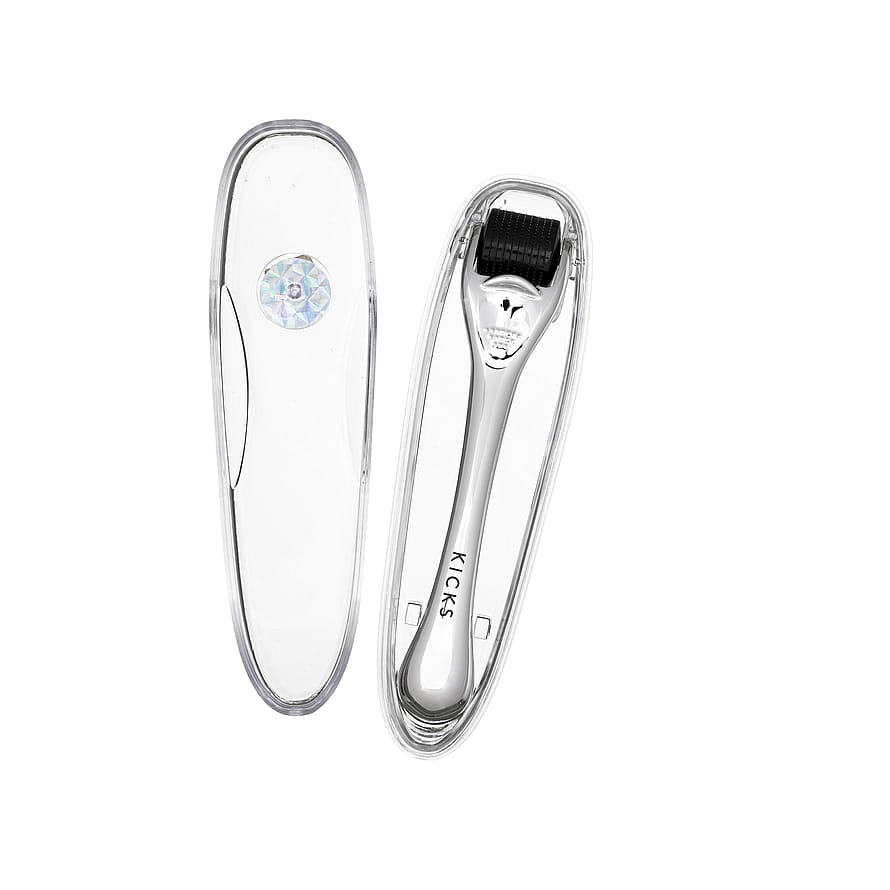 KICKS Derma Roller koostuu 540 mikroneulasta (0,2 mm), jotka tekevät ihoon hellävaraisesti satoja mikroskooppisen pieniä reikiä. Työkalu stimuloi ihoa ja tehostaa kollageenin tuotantoa. Käytön jälkeen iho tuntuu pehmeämmältä ja kiinteämmältä ja sen sävy on tasaisempi.