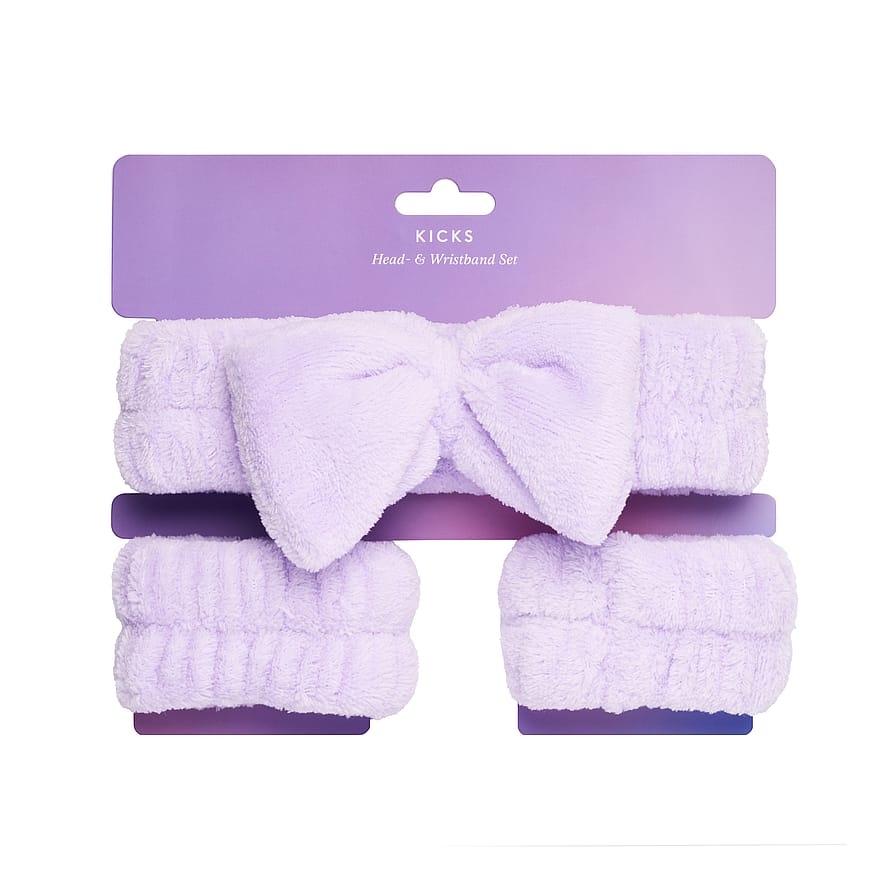 Pehmeästä kankaasta valmistetut hiuspanta ja rannepanta, jotka sopivat täydellisesti pitämään hiukset poissa kasvoilta ja suojaamaan vaatteiden hihoja ihonhoitorutiinia suoritettaessa.