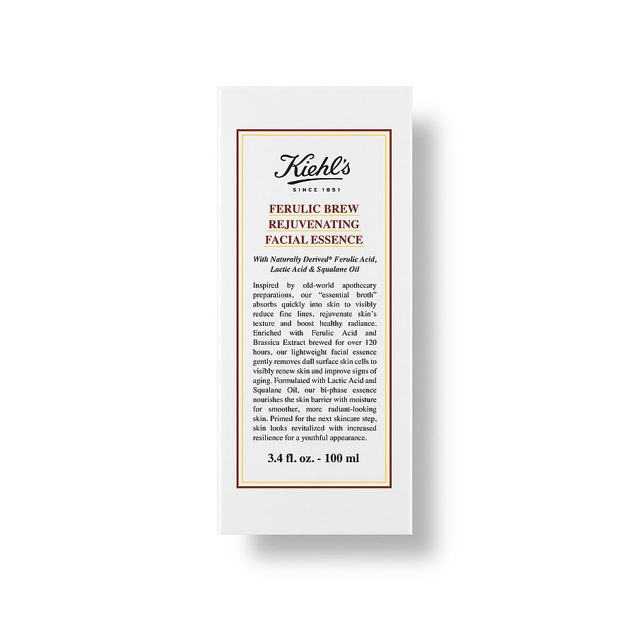 Kiehl'sin ferulihappoa sisältävä kasvovesi on tehokas antioksidantti, joka lisää näkyvästi ihon hehkua, parantaa ihon rakennetta ja häivyttää hienoja juonteita. Kiehl's Ferulic Brew Rejuvenating Facial Essence sisältää luonnollista alkuperää olevaa antioksidanttista ferulihappoa, kuorivaa maitohappoa ja kosteuttavaa skvalaania. Anti age -tiiviste, joka tukee ihon luonnollista uusiutumisprosessia ja tekee ihosta terveen ja nuorekkaan oloisen. • Imeytyy nopeasti ja lisää näkyvästi ihon hehkua, parantaa ihon rakennetta sekä häivyttää hienoja juonteita. • Poistaa hellävaraisesti kuolleita ihosoluja ihon pinnalta ja vahvistaa ihon suojamuuria. Ihosta tulee näkyvästi tasaisempi ja säteilevämpi. • Sisältää tehokkaita antioksidantteja, jotka tukevat ihon luonnollista uusiutumisprosessia ja suojaavat ihoa ennenaikaiselta ikääntymiseltä aiheuttavilta vapailta radikaaleilta. • Valmistelee ihon seerumia varten ja kosteuttaa ihoa osana Kiehl'sin ihonhoitorutiinin ensimmäistä ja tärkeää vaihetta. • Kaikille ihotyypeille, myös herkälle iholle.