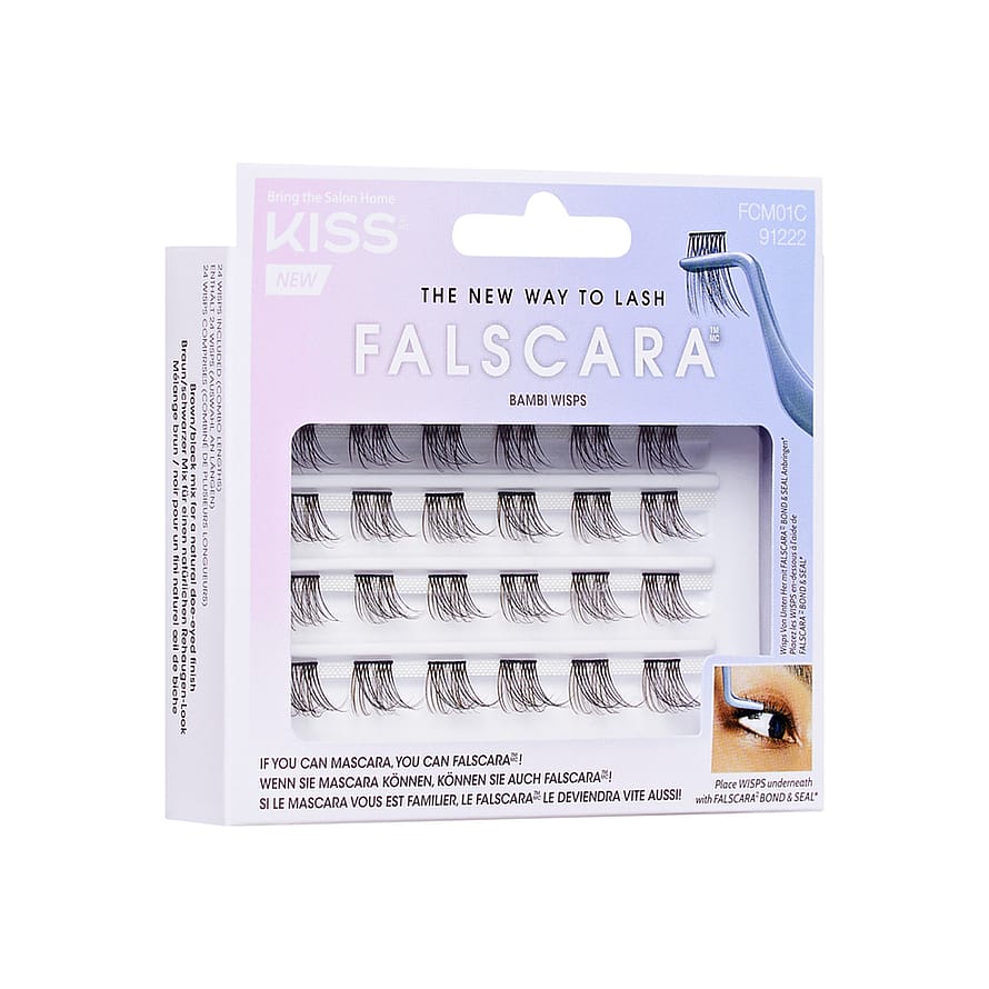 Älä käytä ripsiväriä ennen tai jälkeen Falscara. Harjaa kevyt kerros BONDia luonnollisille ripsille. Käytä mukana toimitettua APPLIKATORIA valitaksesi WISP lokerosta. Poimi WISP keski-ulkopäästä optimaalisen hallinnan saavuttamiseksi. Aseta WISPS varovasti luonnollisten ripsien pohjan alle, hieman poispäin vesirajasta. Levitä ripsien rajan ulkokulmasta sisäänpäin suuntautuen. Taputtele ohut kerros SEAL-liuosta WISPS:n alle poistaaksesi kaikki tahmeat jäämät ja pidä WISPS paikallaan. Kun olet levittänyt SEALin WISPS:n alle, paina WISPS APPLICATORILLA tai sormillasi luonnollisia ripsiäsi vasten. POISTAMINEN: Levitä vanulappuun Falscara REMOVER tai öljytön meikinpoistoaine. Aseta pumpulipuikko silmien päälle 10 sekunniksi, sitten pyyhi tai vedä ripset varovasti pois ja liimaa