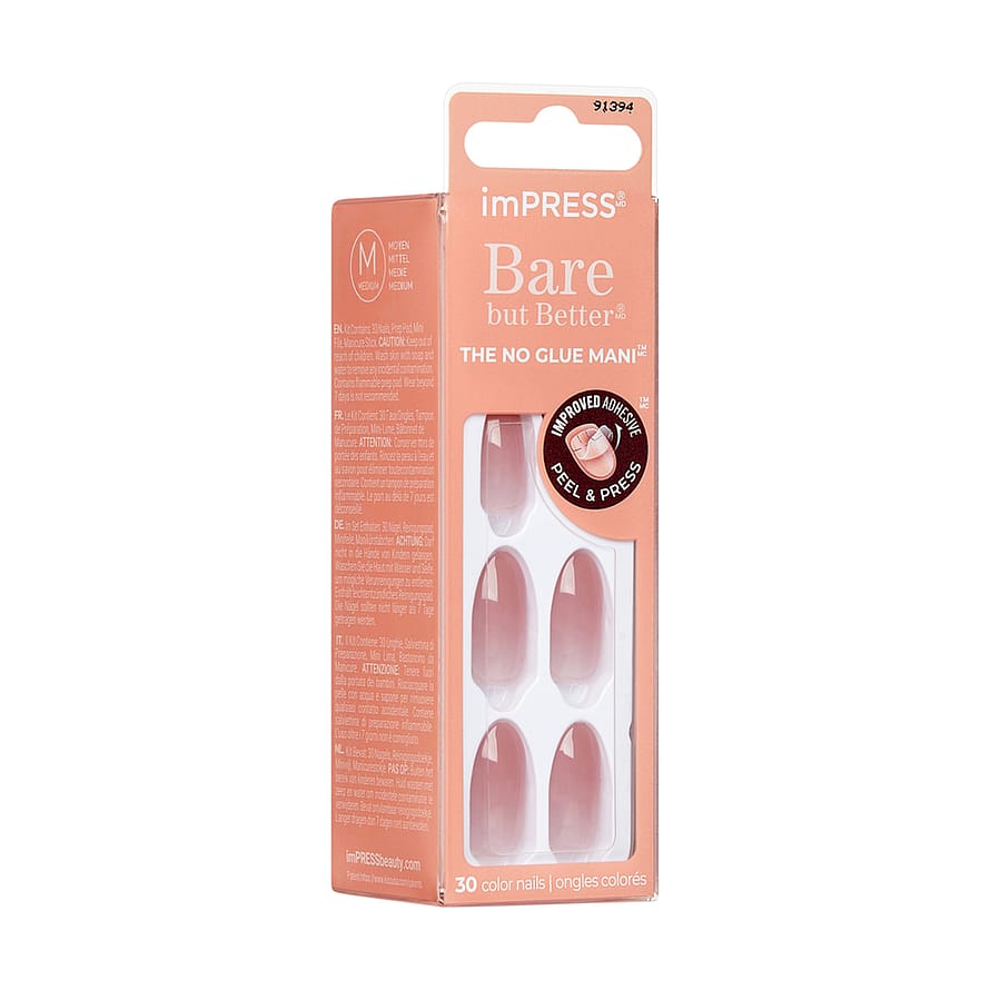 Nude, mutta parempi NO GLUE Color manikyyri? Kyllä kiitos! Löydä täydellinen nude-väri IMPRESS Color Bare but Better -kokoelmalla ja luo trendikkäin look. Uuden parannetun liiman ansiosta kynnet ovat erittäin kestäviä ja kestävät jopa 7 päivää.
