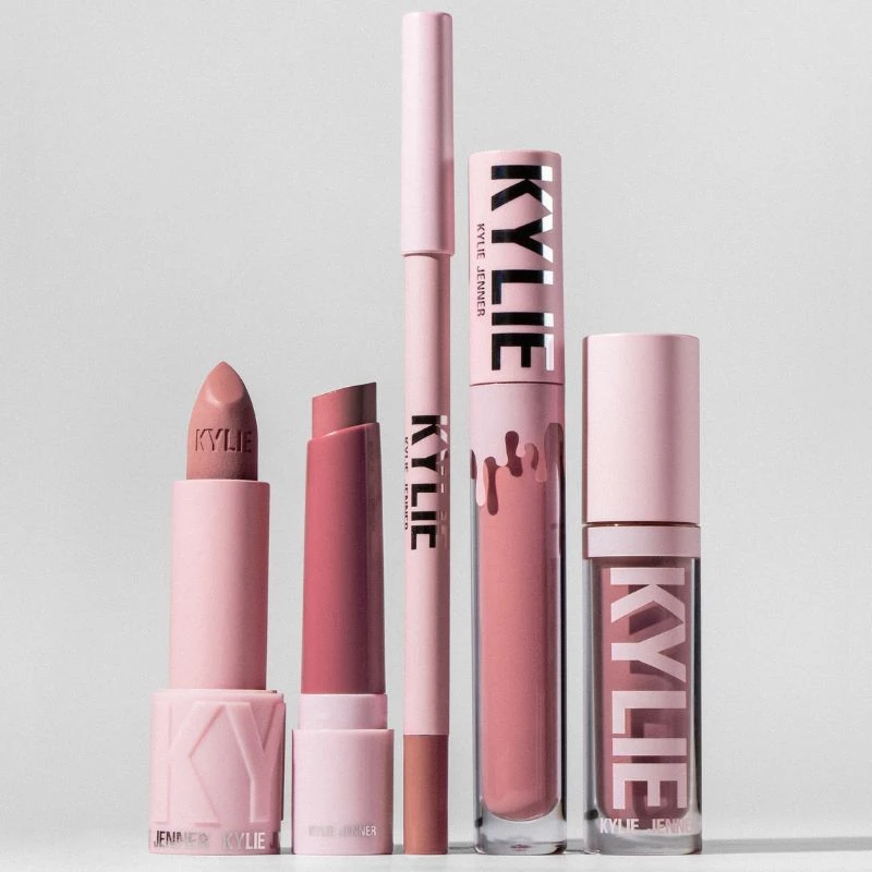 Kylie Jennerin huulikiiltosetti, joka sisältää huulikiillon ja huultenrajauskynän. Tuotepakkaus on vaaleanpunainen ja siinä on huulten kuva.