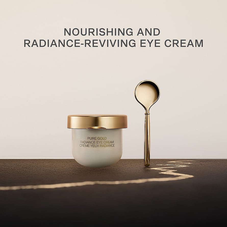 Pure Gold Diffusion System™ -järjestelmän voimalla toimiva Pure Gold Radiance Eye Cream – täyteläinen mutta hienostunut koostumus – ravitsee ja elvyttää herkkää silmänympärysaluetta tukien ihon luonnollisia rytmejä samalla kun se tasoittaa hienoja juonteita ja vastustaa näkyviä muutoksia, jotka usein liittyvät hormonaalisiin vaihteluihin. Exclusive Cellular Complex™ stimuloi kollageenin muodostusta, kun taas Gold & Peptide Powered Meno Complex auttaa minimoimaan näkyviä ikääntymisen merkkejä ja parantamaan ihon tiheyttä sekä kosteustasapainoa.