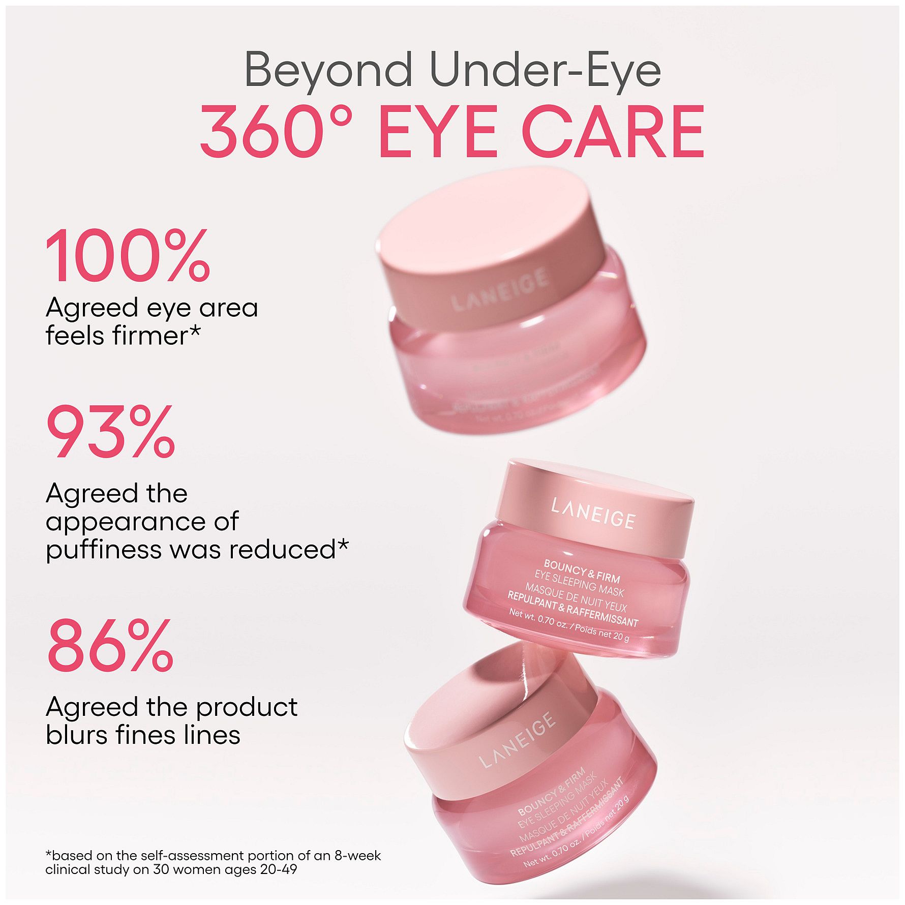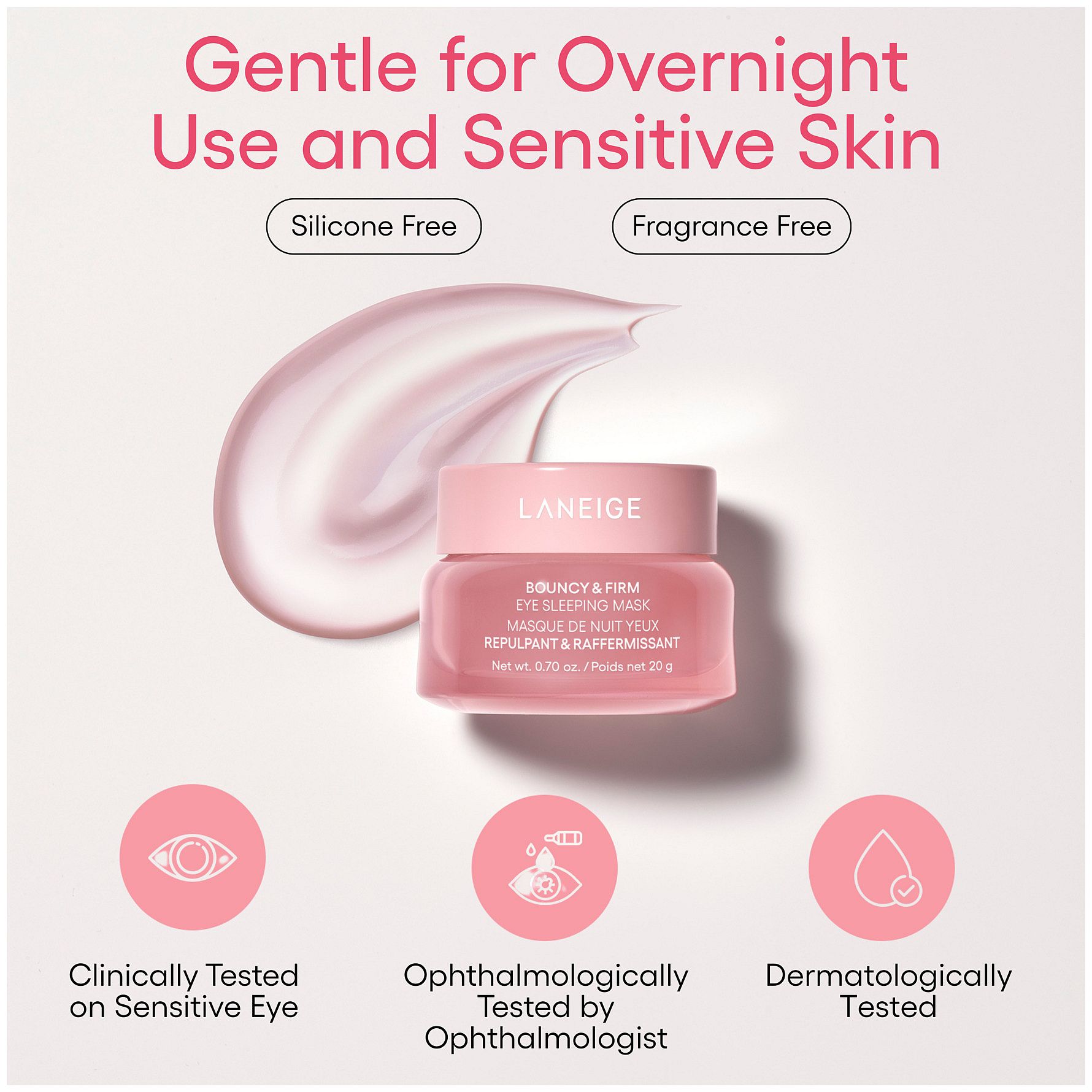 LANEIGE Bouncy & Firm Eye Sleeping Mask kosteuttaa silmänympärysihoa yön aikana ja tekee siitä kirkkaamman ja napakamman. Kevyt viilentävä geelikoostumus auttaa vähentämään turvotusta ja tummuutta. Peony-Collagen Complex, kofeiini ja niasiiniamidi tukevat kiinteyttä ja heleyttä. Peptidit sitovat kosteutta. Herää virkistynein ja tasaisemman näköisin silmänalusin.
