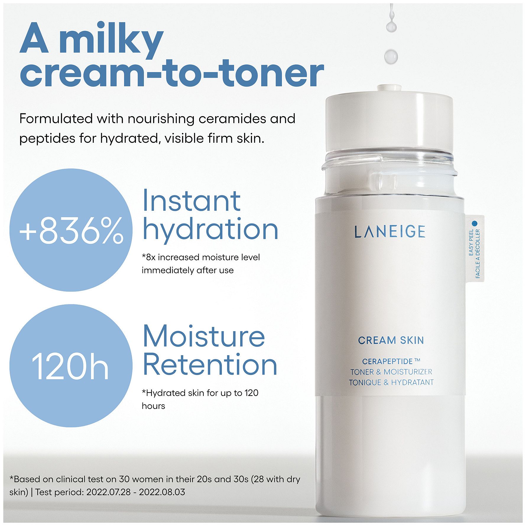 LANEIGE Cream Skin Cerapeptide Toner and Moisturiser on 2-in-1-tuote, joka kosteuttaa tehokkaasti kuivaa ihoa. Kevyt koostumus yhdistää kasvoveden raikkauden ja voiteen ravitsevuuden. Keramidit ja peptidit auttavat kiinteyttämään ja hoitamaan ihoa. Valkoinen teeuute rauhoittaa. Iho jää pehmeäksi, tasaiseksi ja valmiiksi meikkiä tai muuta hoitoa varten.