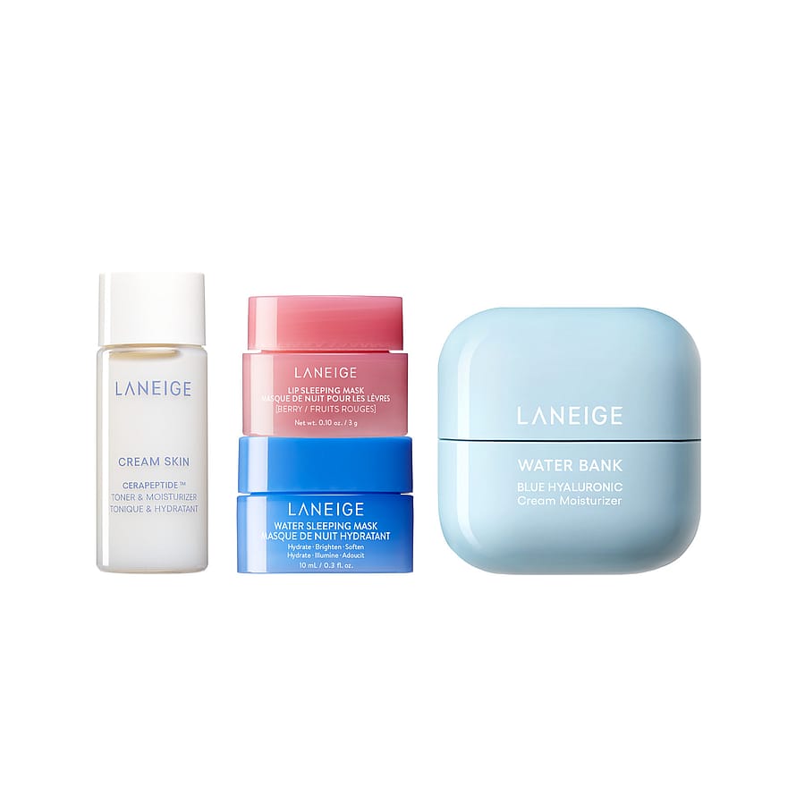 LANEIGE Icons To Get Set on matkakokoinen setti, jossa on neljä suosittua tuotetta heleän ja kosteutetun ihon tueksi. Water Bank Blue Hyaluronic Cream antaa pitkäkestoista kosteutusta. Water Sleeping Mask pehmentää ja uudistaa yön aikana. Lip Sleeping Mask Berry hoitaa kuivia huulia. Cream Skin Cerapeptide Toner and Moisturiser kosteuttaa ja vahvistaa ihoa. Täydellinen kokeiltavaksi, lahjaksi tai mukaan matkalle.