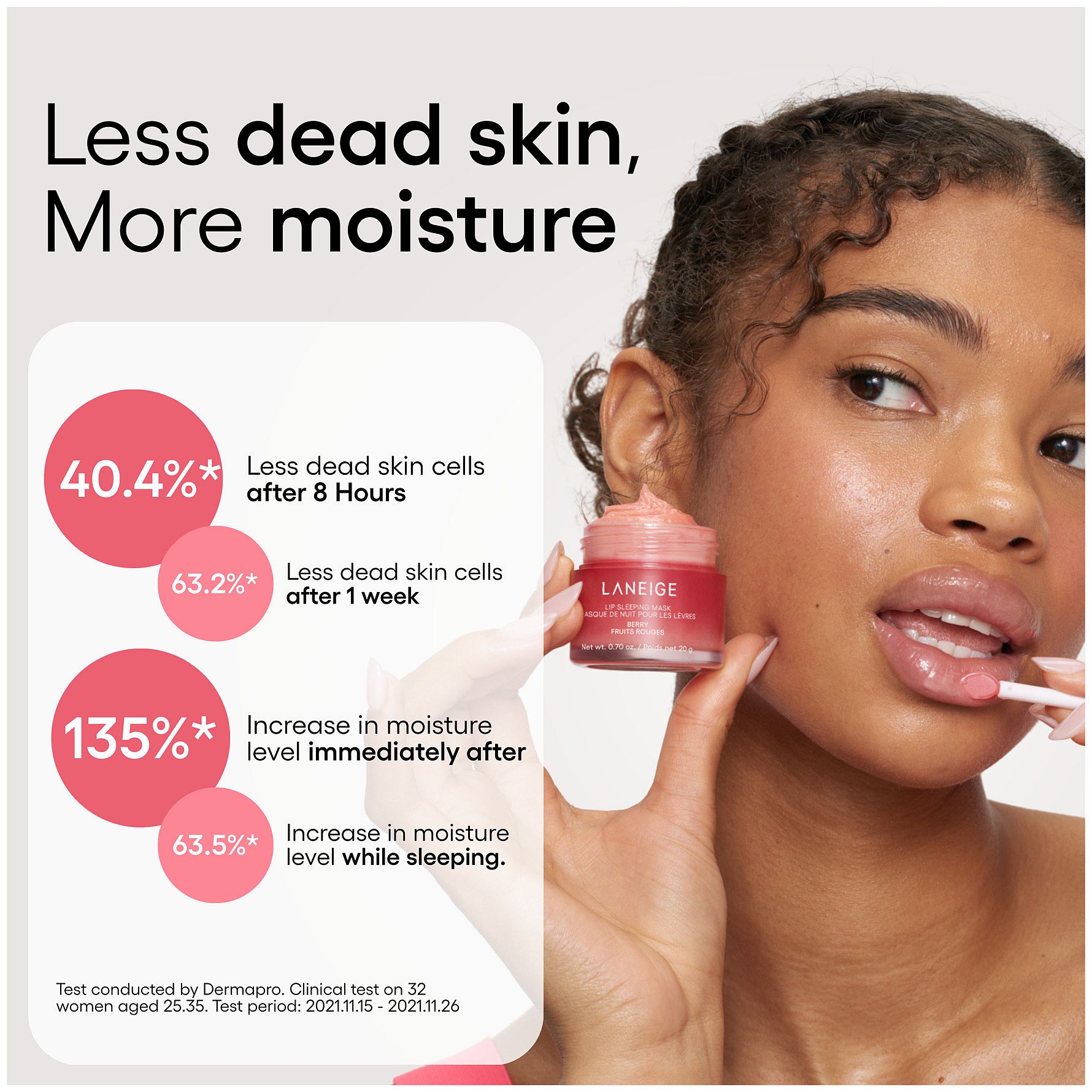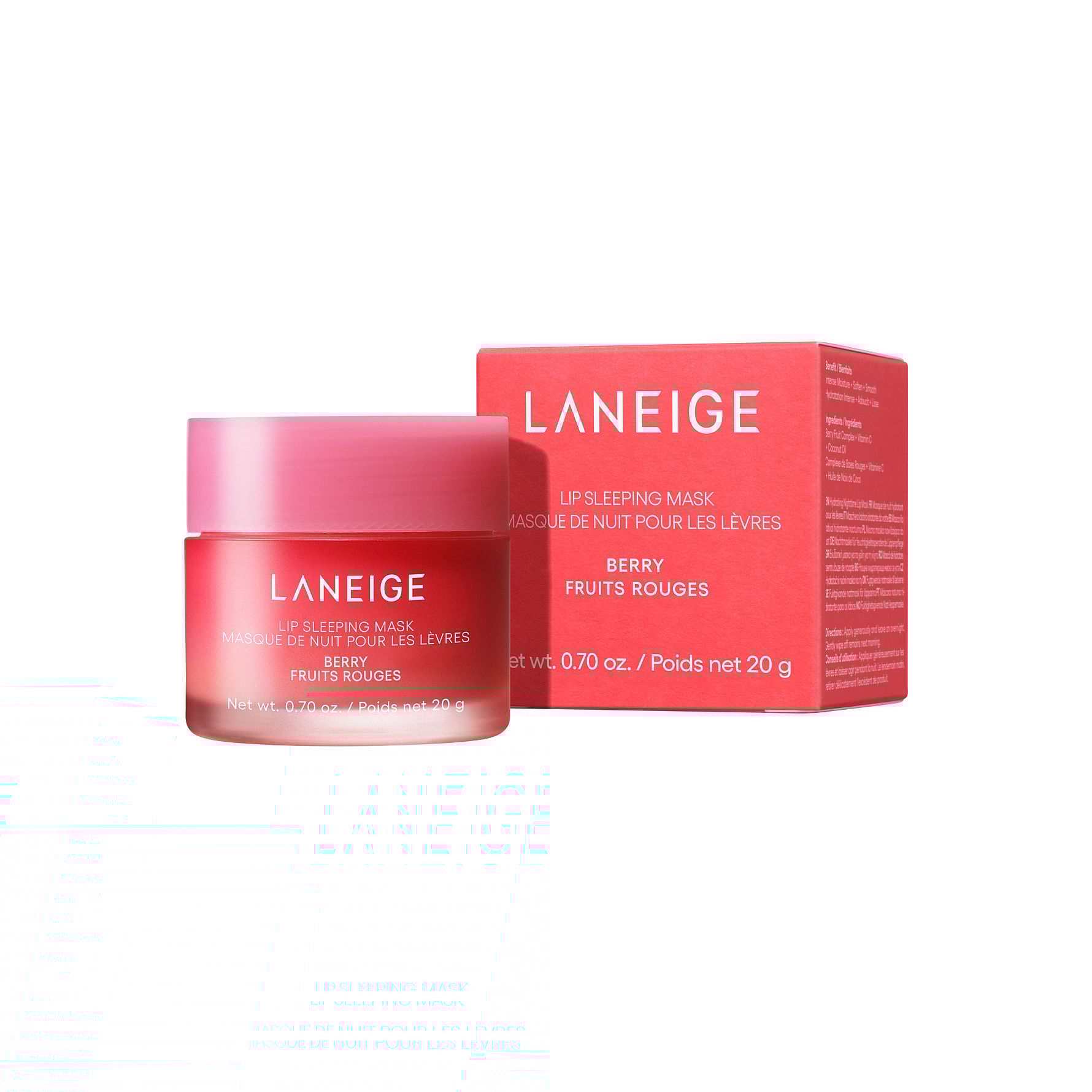 LANEIGE Lip Sleeping Mask on myydyin huulinaamio, joka ravitsee intensiivisesti ja tekee huulista pehmeät ja täyteläiset. Saatavilla herkullisissa mauissa, auttaa vähentämään kuivuutta ja rohtumia. Moisture Wrap™ -teknologia muodostaa suojaavan kalvon, joka lukitsee kosteuden. Hyaluronihappo ja mineraalit kosteuttavat tehokkaasti. Berry Mix Complex™ sisältää vadelmaa, mansikkaa, karpaloa ja mustikkaa – sheavoi pehmentää ja hoitaa. Levitä iltaisin ennen nukkumaanmenoa. Mukana kätevä applikaattori.