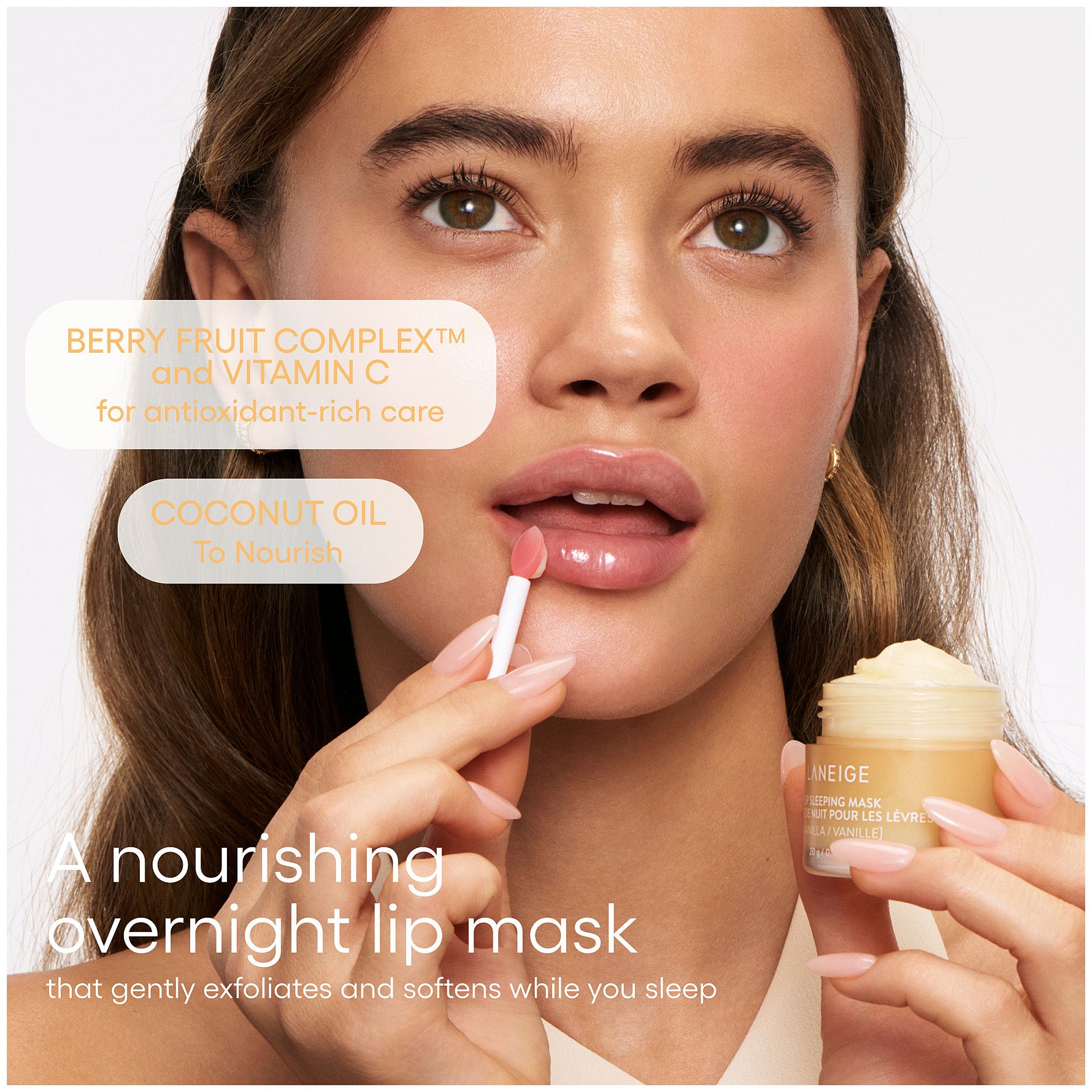 LANEIGE Lip Sleeping Mask on myydyin huulinaamio, joka ravitsee intensiivisesti ja tekee huulista pehmeät ja täyteläiset. Saatavilla herkullisissa mauissa, auttaa vähentämään kuivuutta ja rohtumia. Moisture Wrap™ -teknologia muodostaa suojaavan kalvon, joka lukitsee kosteuden. Hyaluronihappo ja mineraalit kosteuttavat tehokkaasti. Berry Mix Complex™ sisältää vadelmaa, mansikkaa, karpaloa ja mustikkaa – sheavoi pehmentää ja hoitaa. Levitä iltaisin ennen nukkumaanmenoa. Mukana kätevä applikaattori.
