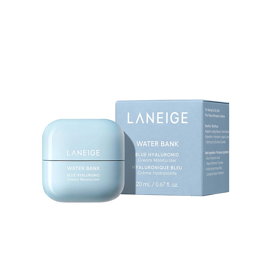 LANEIGE Water Bank Blue Hyaluronic Cream Moisturizer lukitsee kosteuden ihoon ja tarjoaa pitkäkestoista hoitoa kuivalle iholle. Ylellinen koostumus pehmentää, ravitsee ja tuo kasvoille luonnollista hehkua. Sininen hyaluronihappo mikrokoossa tehostaa kosteutusta ja imeytymistä. Päivittäiseen käyttöön sopiva voide tukee ihon kosteussuojaa jopa 100 tunnin ajan. Iho näyttää sileämmältä, kirkkaammalta ja tasaisemmalta.