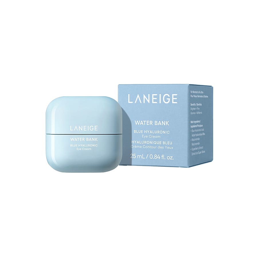 LANEIGE Water Bank Blue Hyaluronic Eye Cream kosteuttaa tehokkaasti kuivaa ja väsynyttä silmänympärysihoa. Silkkinen koostumus kirkastaa ja raikastaa katsetta. Sisältää sinistä hyaluronihappoa ja kosteuttavaa fucoidania, jotka auttavat silottamaan juonteita, häivyttämään tummia silmänalusia ja tekemään ihosta täyteläisemmän. Lopputuloksena on levänneen ja heleän näköinen silmänympärys.