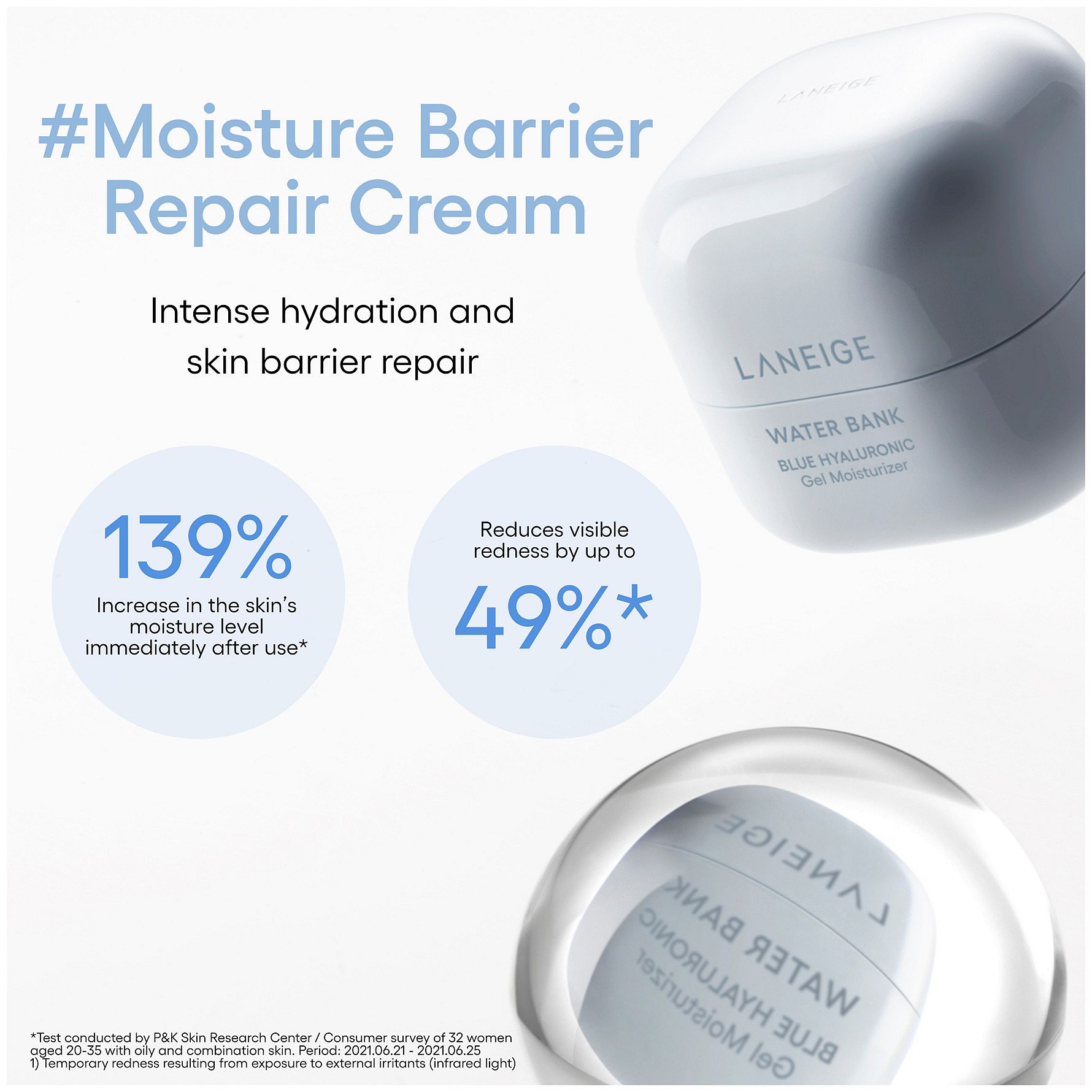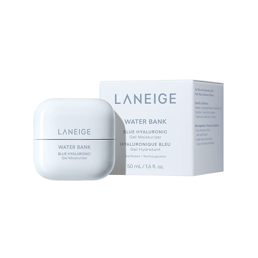 LANEIGE Water Bank Blue Hyaluronic Gel Moisturizer kosteuttaa jopa 48 tuntia. Raikas geelikoostumus sisältää sinistä hyaluronihappoa, jota on fermentoitu syvänmeren levän kanssa ja suodatettu paremman imeytymisen takaamiseksi. Pienet molekyylit tarjoavat intensiivistä kosteutusta ilman raskasta tunnetta. Viilentävä minttu-uute auttaa hillitsemään ylimääräistä talia ja kiiltoa. Sopii rasvoittuvalle tai sekaiholle. Iho jää raikkaaksi, pehmeäksi ja tasapainoiseksi.