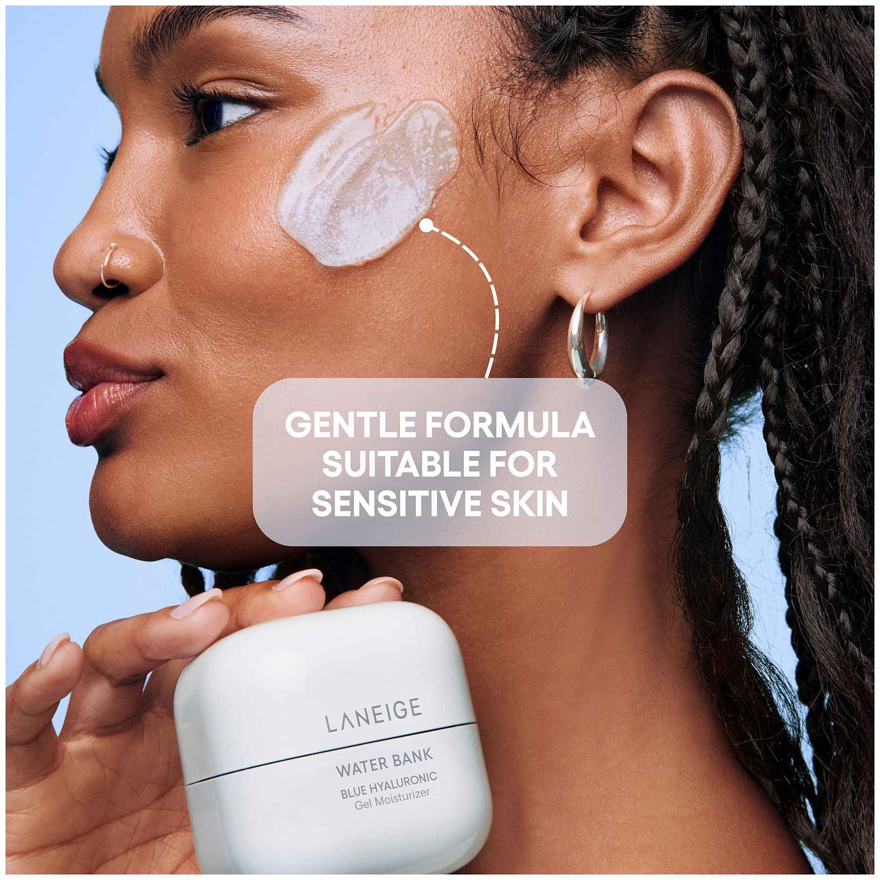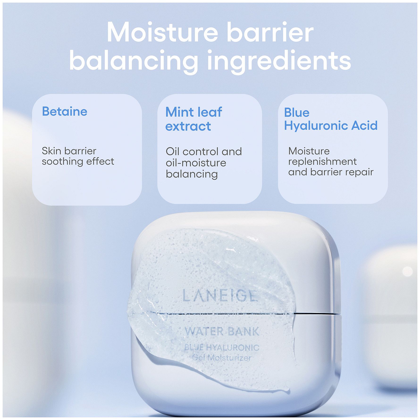 LANEIGE Water Bank Blue Hyaluronic Gel Moisturizer kosteuttaa jopa 48 tuntia. Raikas geelikoostumus sisältää sinistä hyaluronihappoa, jota on fermentoitu syvänmeren levän kanssa ja suodatettu paremman imeytymisen takaamiseksi. Pienet molekyylit tarjoavat intensiivistä kosteutusta ilman raskasta tunnetta. Viilentävä minttu-uute auttaa hillitsemään ylimääräistä talia ja kiiltoa. Sopii rasvoittuvalle tai sekaiholle. Iho jää raikkaaksi, pehmeäksi ja tasapainoiseksi.