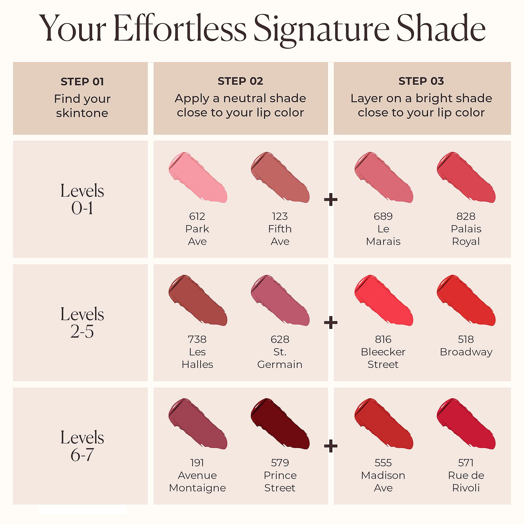 Saatavana 12 uudelleen täytettävää herkullista sävyä, jotka vaihtelevat arkisista nudesävyistä rohkeisiin punaisiin joka tilanteeseen ja ihonväriin.