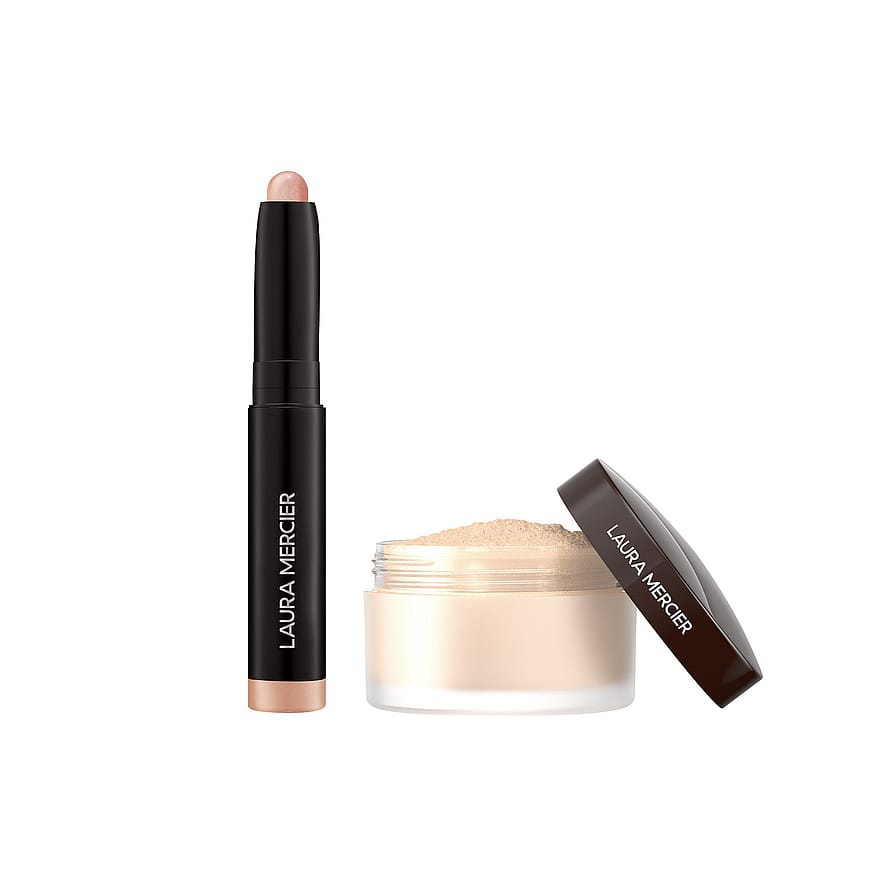 Limited edition Laura Mercier -setti, joka sisältää mini Caviar Stick -luomivärin sävyssä Rosegold ja mini Translucent Loose Setting Powder -sävyssä Translucent.