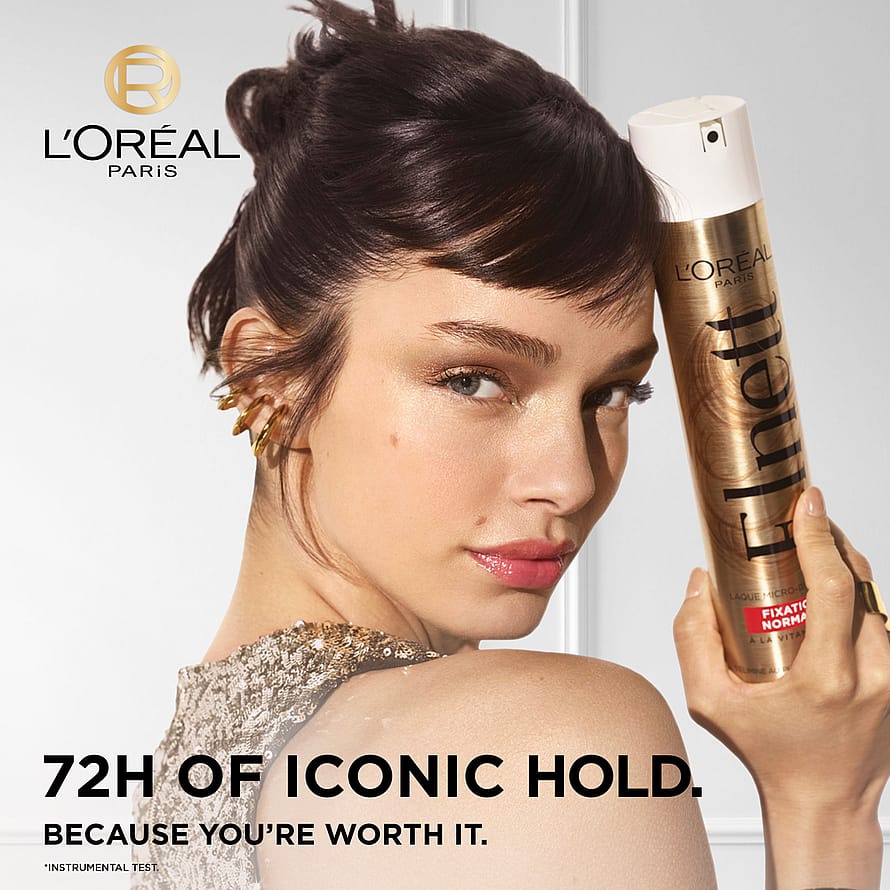 L'Oréal Paris Elnett Hair Spray Strong -hiuslakka sopii kaikille hiustyypeille. Koostumus antaa näkymätöntä voimakasta pitoa jopa 72 tunnin ajan ilman jäykkää tunnetta ja se lähtee hiuksista helposti harjaamalla. Hiuslakan koostumus sisältää B5-provitamiinia ja se suojaa hiuksia pörröisyydeltä.