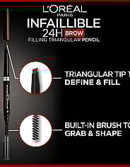 L'Oréal Paris Infaillible Brows 24H Filling Triangular Pencil -kulmakynällä saat muotoillut kulmat ja luonnolliselta näyttävän lopputuloksen jopa 24 tunniksi*. Pehmeä voidemainen koostumus levittyy helposti kolmion muotoisen kärjen avulla. Käytä 24H Filling Triangular -kulmakynän toisessa päässä olevaa harjaa kulmien muotoiluun. Vedenkestävä koostumus, joka ei leviä ja tuntuu miellyttävältä koko päivän.
