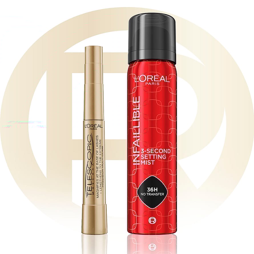 ICONIC Duo -lahjapakkaus sisältää mustan L'Oréal Paris Telescopic -maskaran ja L'Oréal Paris Infaillible 3-Second Setting Mist -meikinkiinnityssuihkeen.